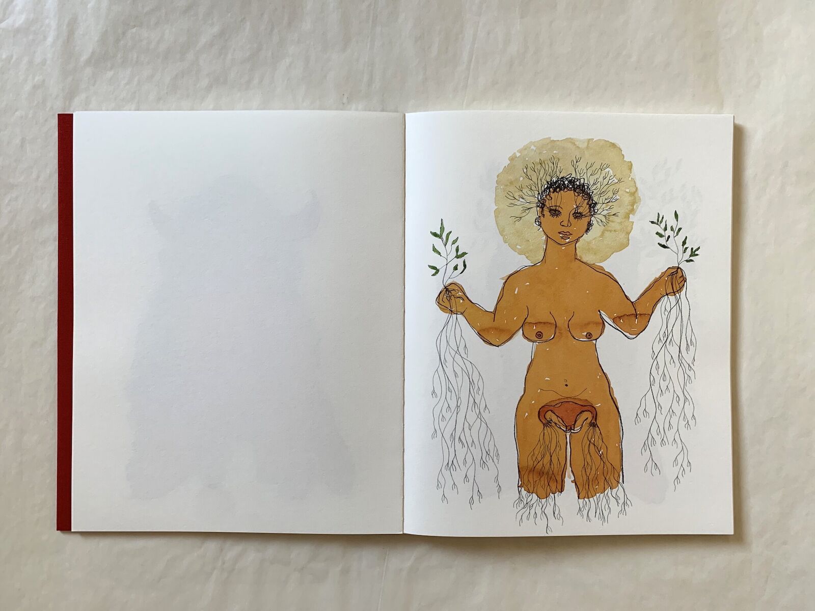 The series are first cousins. They talk to each other, complement each other, support and learn from each other. Their encounter also results from the affinity developed between artist and publisher. Together, they translated into this book-object part of the research, poetics, and materiality of Rosana's work. On the cover, we touch the same material applied in many of the artist’s pieces. The fabric, which is frequently used as a medium for printing photographs that Rosana then manipulates with thread and needle, here embraces and protects the drawings. As we open the book, the texture changes and we see the potential of drawing to subvert hegemonic discourses and claim expropriated subjectivities as in a ritual of healing and empowerment. Rosana dives into the construction of the image of black women in Brazil and brings to the surface the sensorial memory of a past-present of pain, but also of resistance. First, she works in watercolor stains and then outlines the forms in pencil. Feminine forms that are emancipated and sensual.