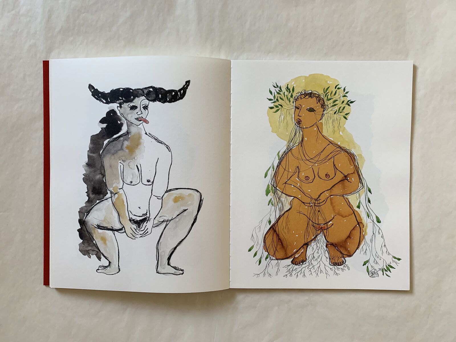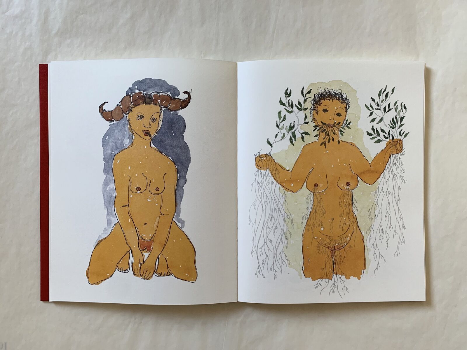 We all identify with or would love to be like the Buffalo and Lady of Plants, and the book allows us to slowly discover (ourselves in) these women. Turning the pages, we find between them one of the notebooks that the artist fills in on her daily walks through the parks around her home. Rosana needs to feel on her skin the strength of the Atlantic Forest, the humid air and the sound of nature. These drawings, rescued in one of the book's creative process meetings, are the seed of the two feminine archetypes presented in this edition. They reflect the artist's attempt to merge with the natural world and remind us of our proximity to it: seeds and fruits are like our sexual organs, roots and branches are like arms, legs, or our respiratory system. We are part of and side by side with nature, never above it.