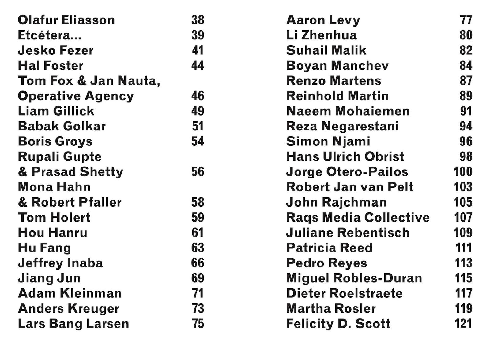 Nikolaus Hirsch, Markus Miessen, David Adjaye, Jan Nauta, Kader Attia, Nairy Baghramian, Andrew Benjamin, Federica Bueti, Tom Fox, Armin Linke, Operative Agency, Salahuddin Ahmed, Franco “Bifo” Berardi, Ben van Berkel, Neeraj Bhatia, Tony Chakar, Boris Charmatz