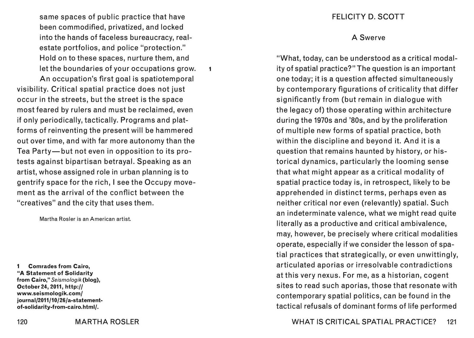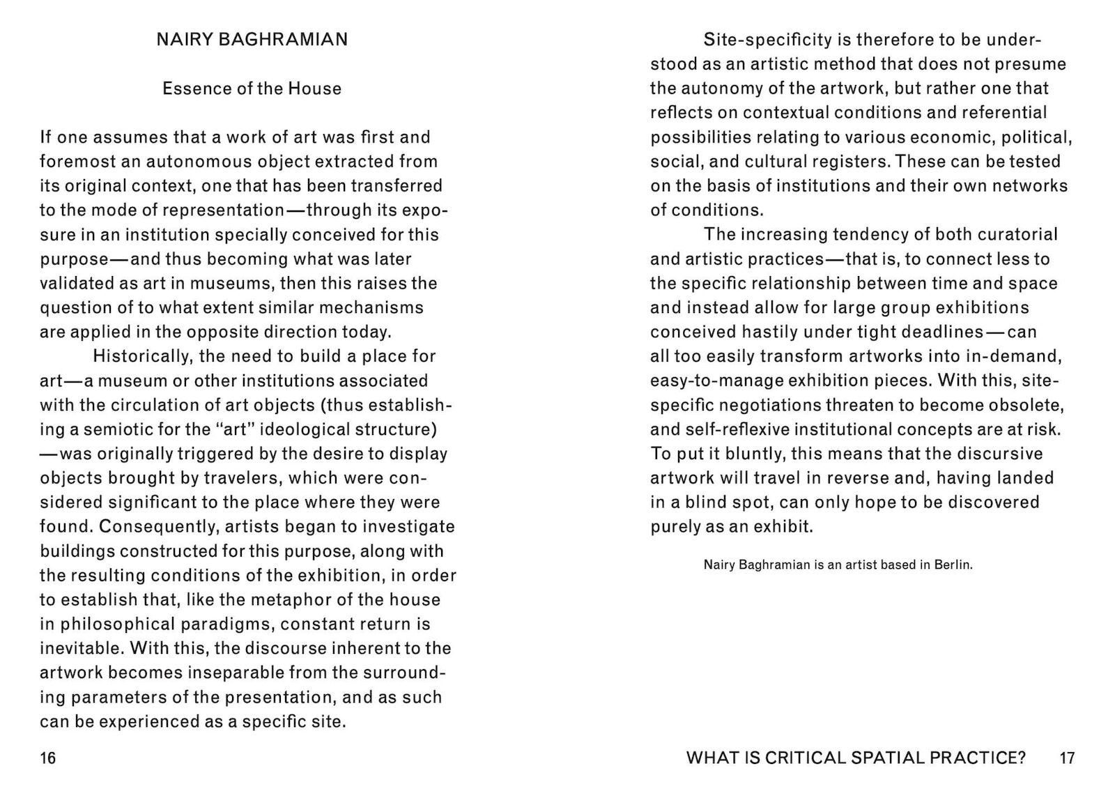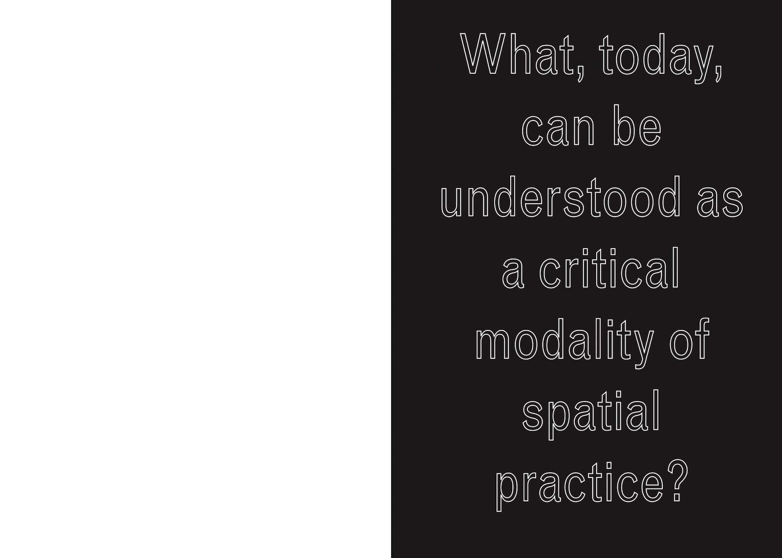 In September 2011, Nikolaus Hirsch and Markus Miessen invited protagonists from the fields of architecture, art, philosophy, and literature to reflect on the single question of what, today, can be understood as a critical modality of spatial practice. Most of the sixty-four contribu