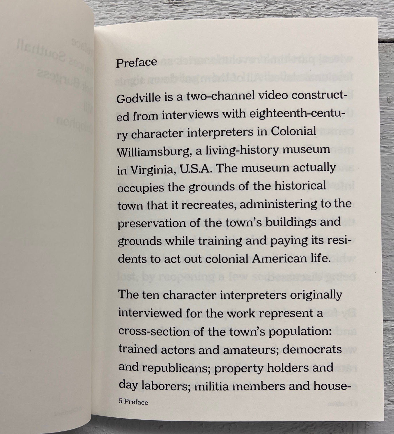 Rare BookGodville is a two-channel video edited from interviews with several eighteenth-century character interpreters in