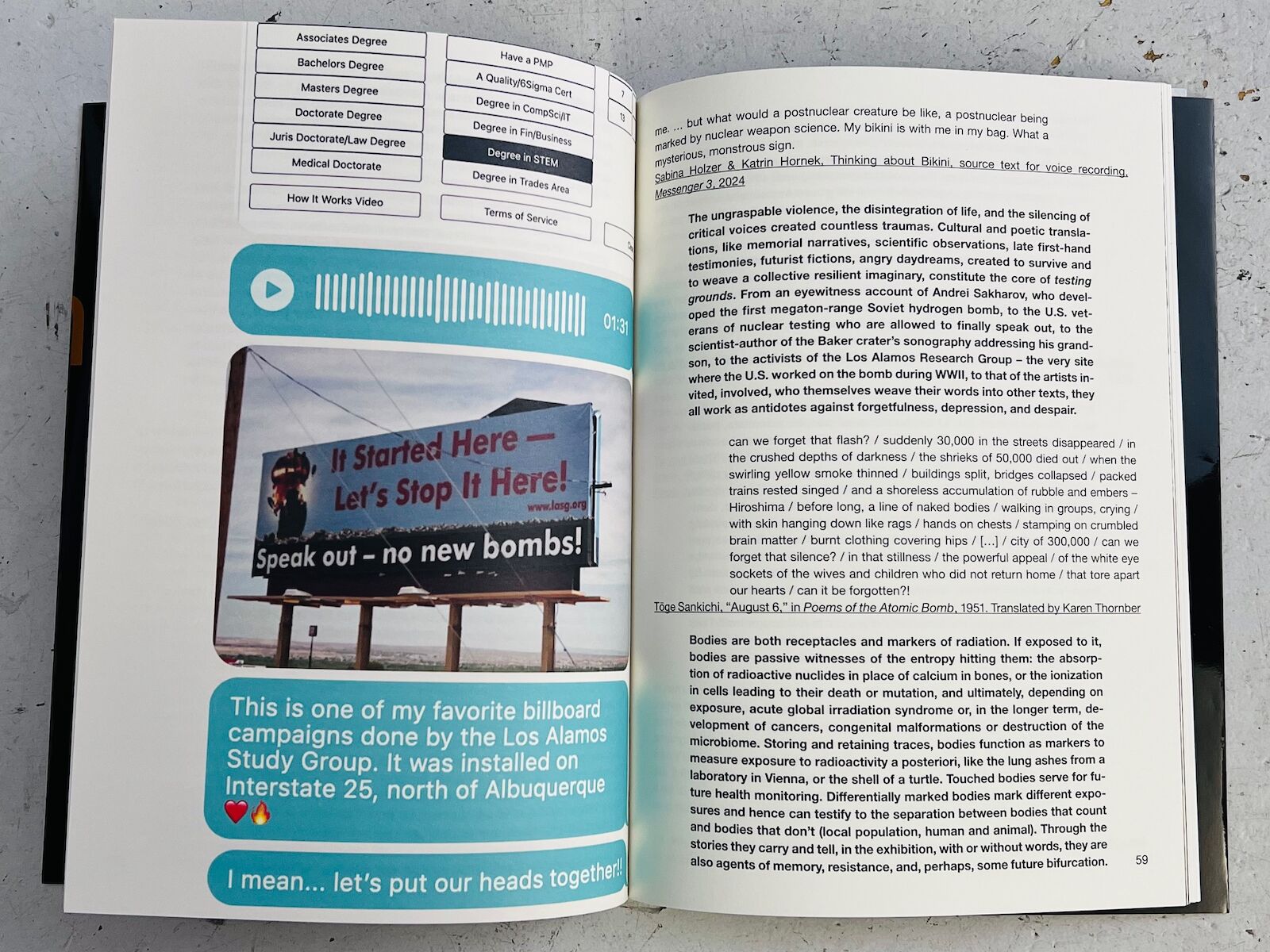 The publication accompanying the exhibition testing grounds reflects Katrin Hornek’s artistic approach, which is based on interdisciplinary research and collaboration. This new, immersive installation deals with the measurable global evidence of radioactive radiation as a result of hundreds of above-ground nuclear weapons tests since 1945. Screenshots of chat histories and