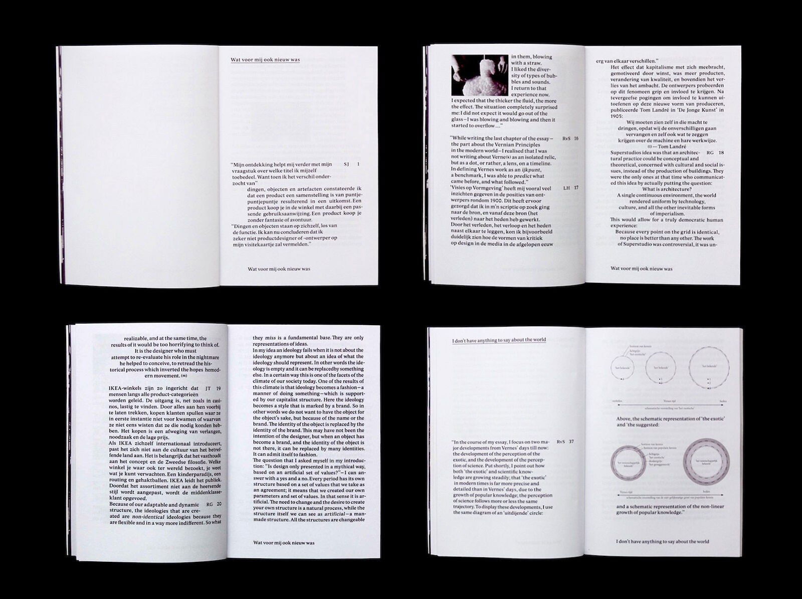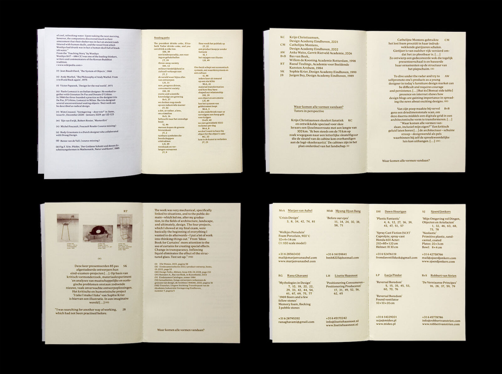 Composed of direct speech, quotes and fragments from essays the students wrote in the course of their graduation, the outcome is an imaginary conversation that shares the discursive mentality of the department.