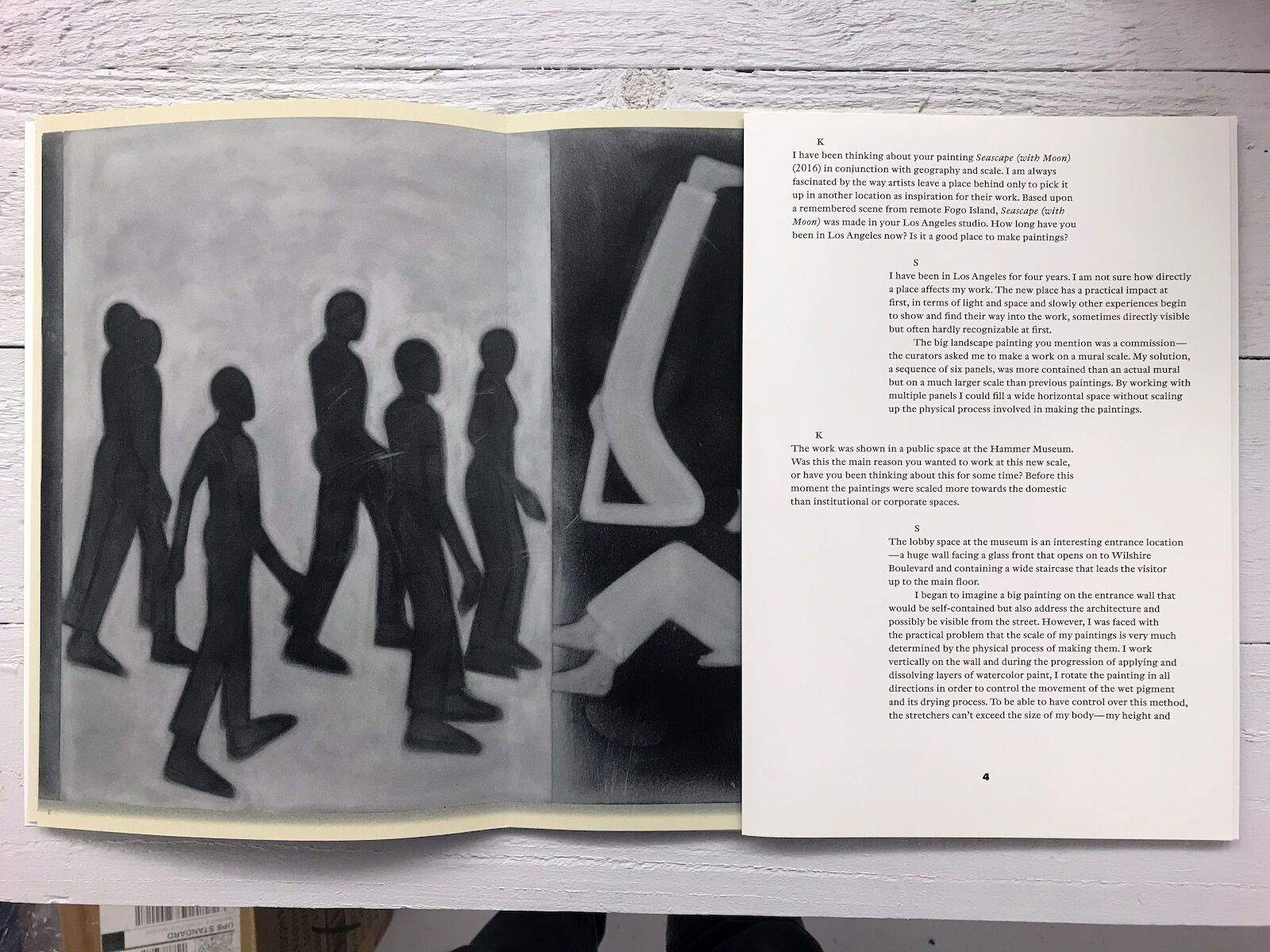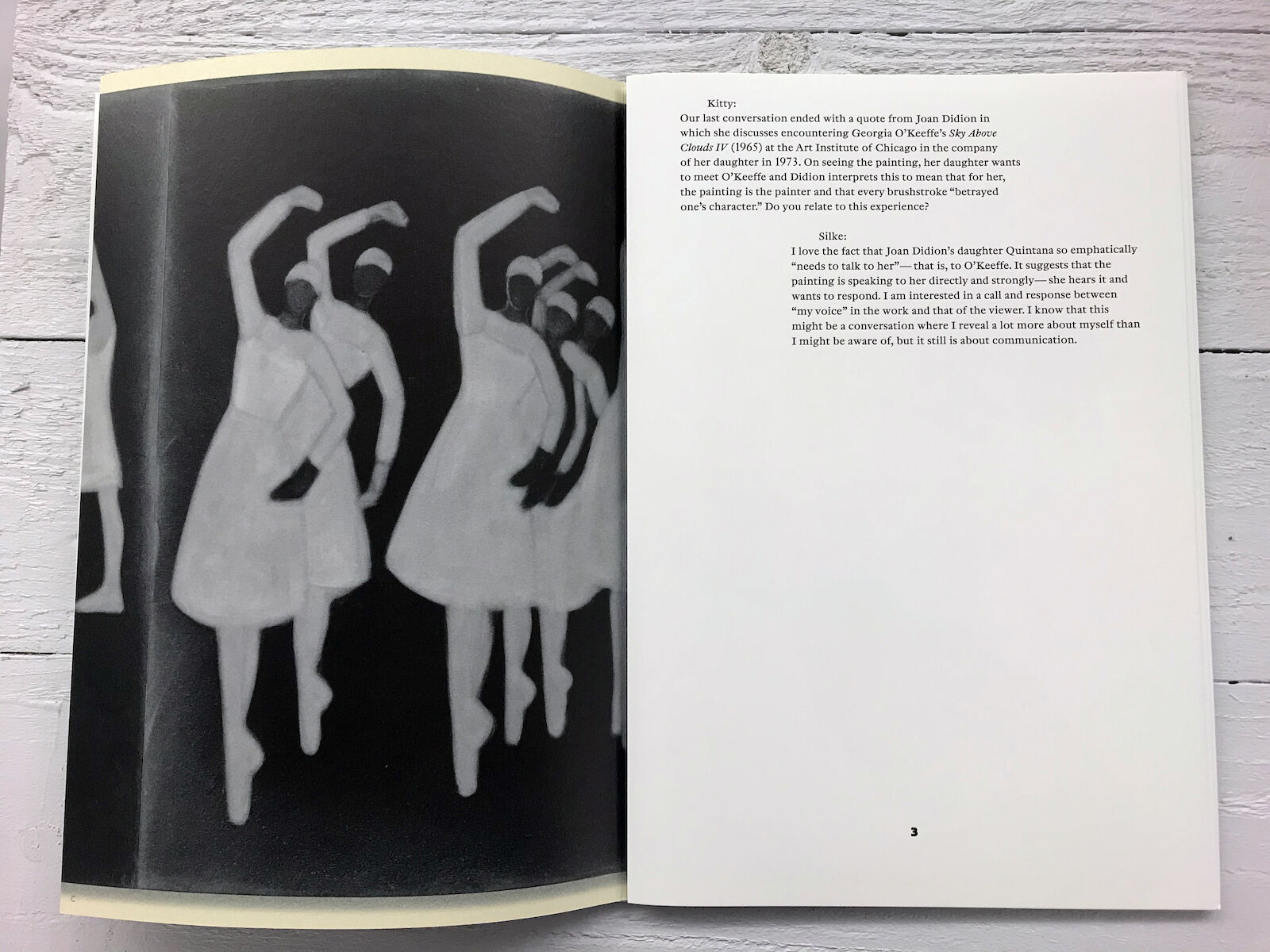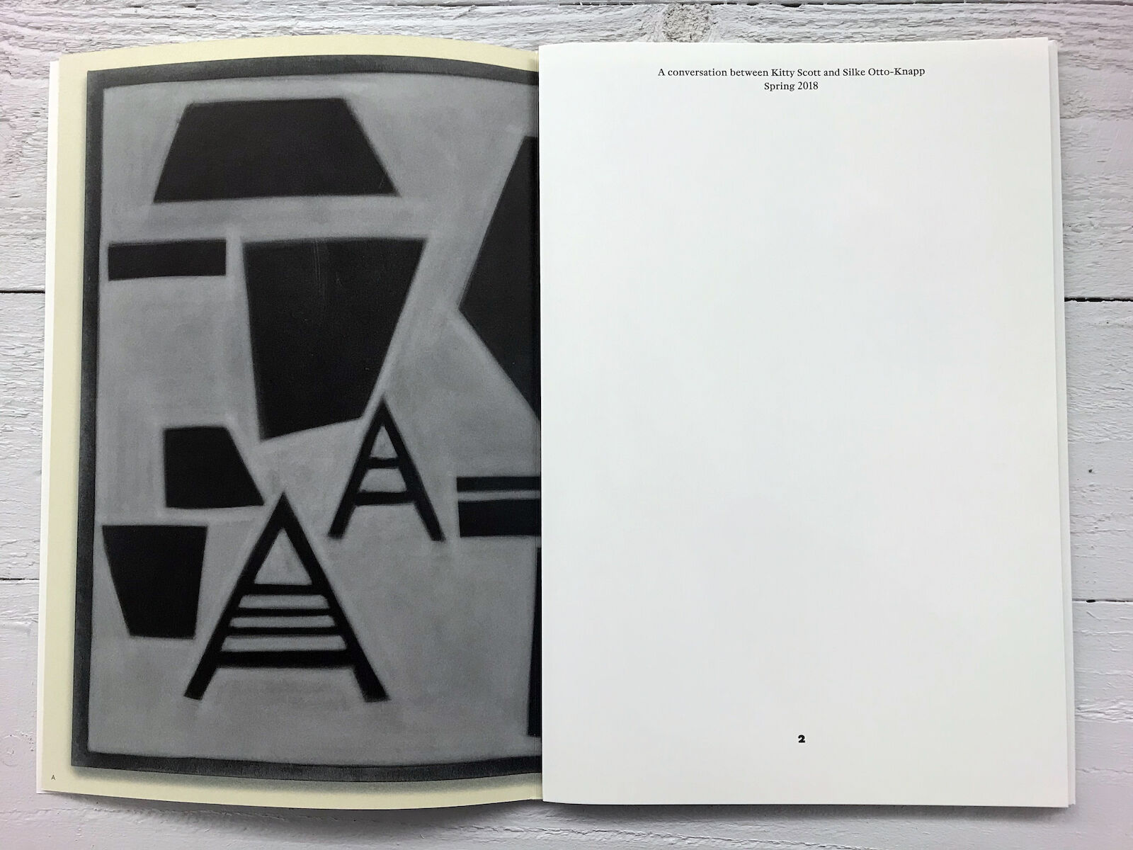 When gathered in order according to the numbers at the foot of each page, and folded in half with the gloss side facing outwards, nine of these sheets carry a conversation between artist Silke Otto-Knapp and curator Kitty Scott. The conversation is interspersed with a photograph of a 17.9 meter-long horizontal frieze built from thirteen of Silke's paintings reproduced on the matte side using a color calibration system developed by Maximage with two different blacks and an opaque white.
