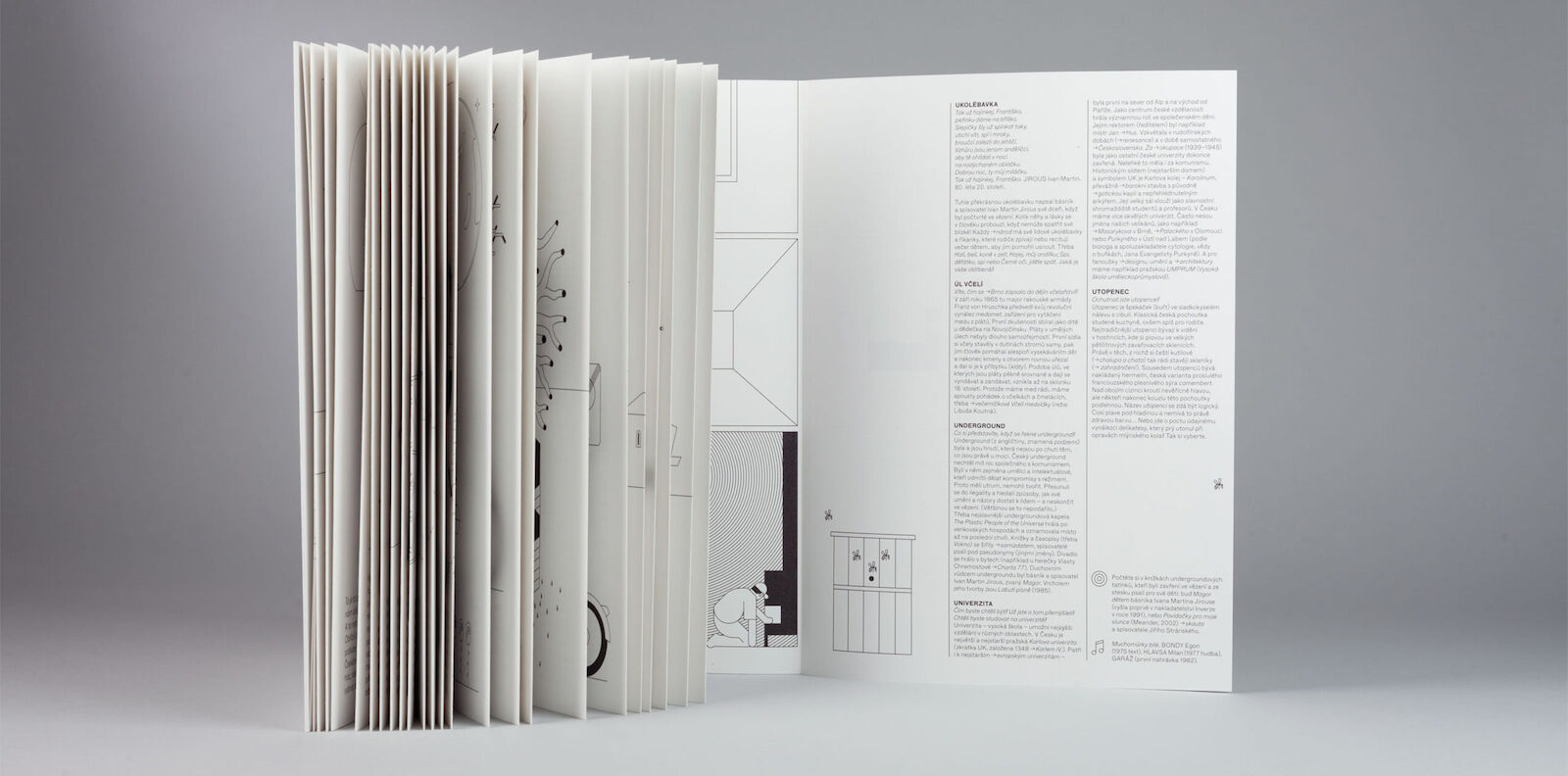covering topics ranging from gastronomy, geography and history to technology, art and design. Each letter of the alphabet is represented by keywords that are simply explained in an interactive form and accompanied by appealing illustrations. The opening text for each letter provides a light-hearted link between all the following entries, and usually contains a hidden fairy-tale character and a proverb. At the end of each letter you will find a task and song. There are 28 letters and 257 keywords in the book, which may be used in different ways. You can start with the pictures then find and read the corresponding entry, or search for words or a proverb in the lead-in text for each letter then read the full entry below. The English booklet lists keywords in the same Czech alphabetical order, with direct (or descriptive) translations in brackets.