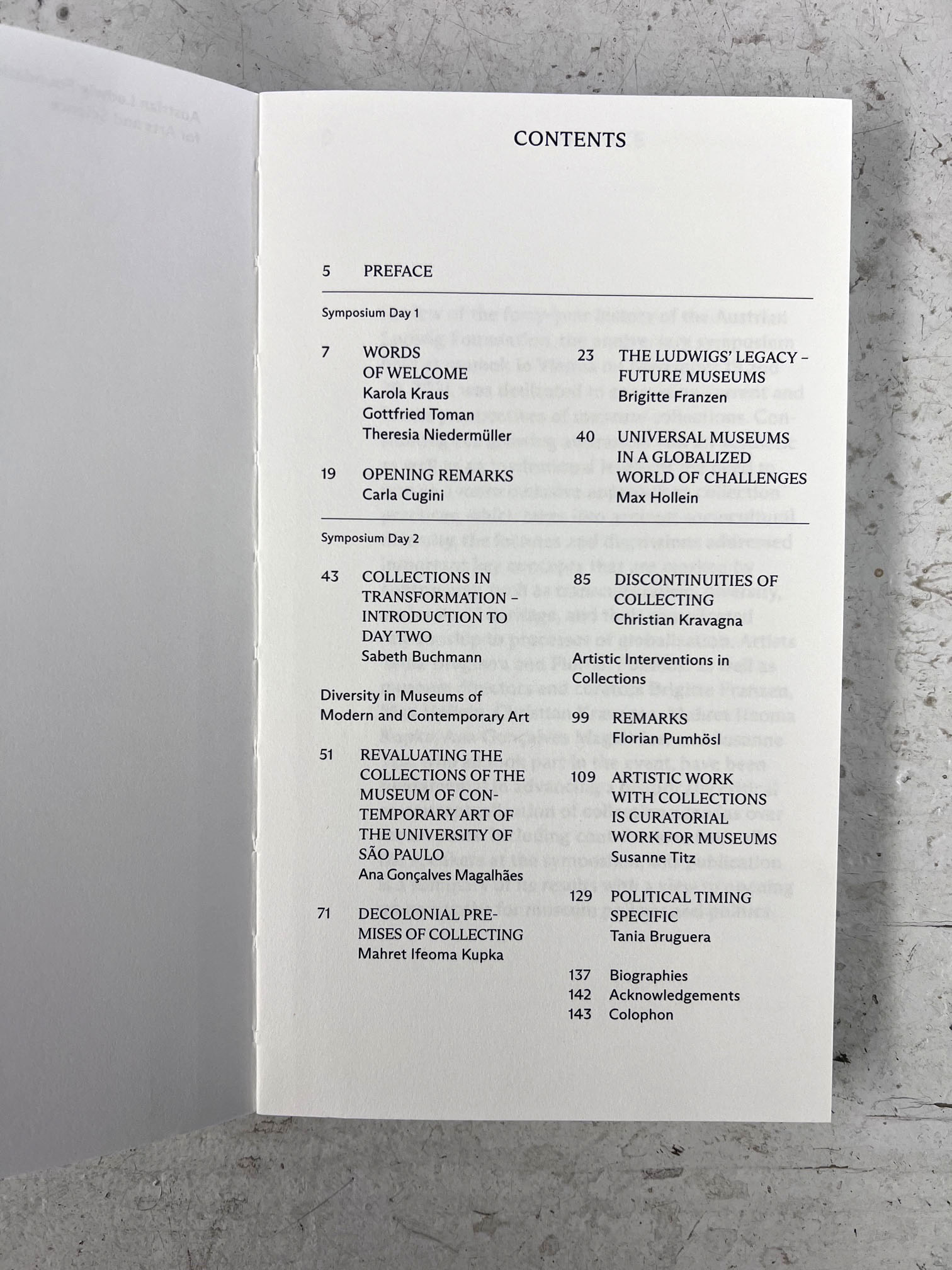 Artists Tania Bruguera and Florian Pumhösl as well as museum directors and curators Brigitte Franzen, Max Hollein, Christian Kravagna, Mahret Ifeoma Kupka, Ana Gonçalves Magalhães, and Susanne Titz, who have all been fundamental in advancing a historically critical reconceptualization of collection agendas over recent years, contributed to the symposium and this publication.