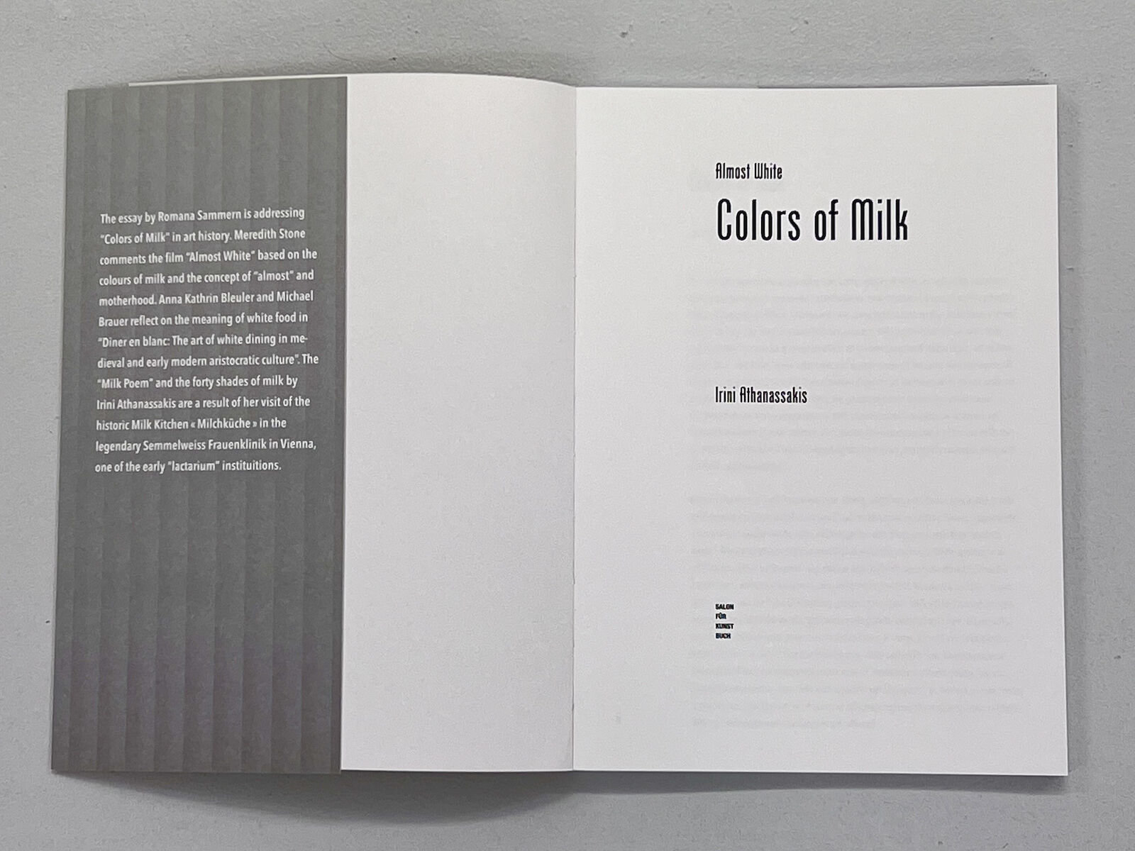 The essay by Romana Sammern is addressing “Colors of Milk” in art history, Meredith Stone comments the film “Almost White” based on the colors of milk and the concept of “almost” and motherhood, and Anna Kathrin Bleuler and Michael Brauer reflect the meaning of white food in “Diner en blanc: The art of white dining dining in medieval and early modern aristocratic culture”. The “Milk Poem” by Irini Athanassakis is a result of her visit of the historic Milk Kitchen « Milchküche » in the legendary Semmelweis Frauenklinik in Vienna, one of the early «lactarium » institutions and questions milk as part of the human body transformed into a commodity.