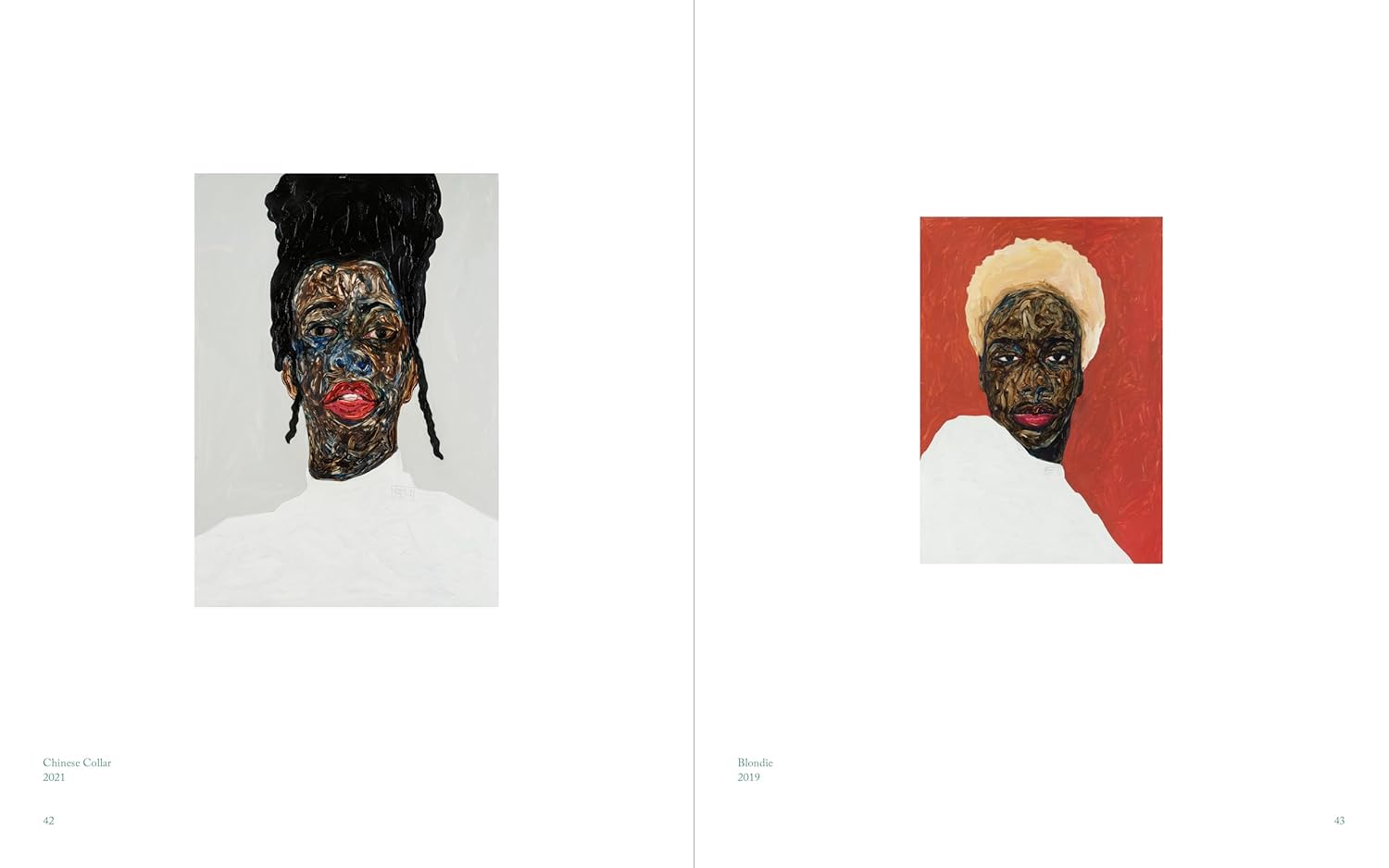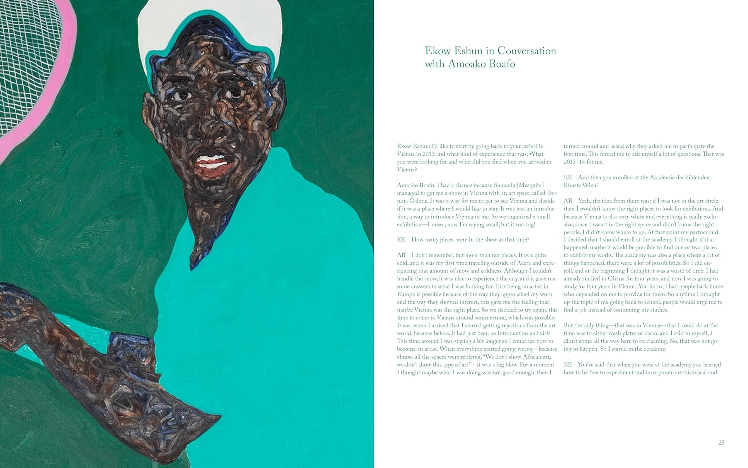 Boafo portrays his friends, acquaintances, and people from public life, presenting a contemporary image of Black self-empowerment and self-perception. After graduating from art college in Accra, Boafo began studying at the Academy of Fine Arts in Vienna in 2013, where he developed his signature style characterized by his unusual finger-painting technique. The people portrayed by Boafo embody the idea of Black identity that draws on its own culture, to be understood as an act of resistance against the racist labels of a predominantly white society. The artist’s intensive engagement with Black history is subtly reflected in his paintings that include motifs inspired by literary works by key pioneers of the Black Freedom Movement. Text: Sergey Harutoonian, Mahret Ifeoma Kupka, Ekow Eshun / Amoako Boafo, Taiye Selasi.