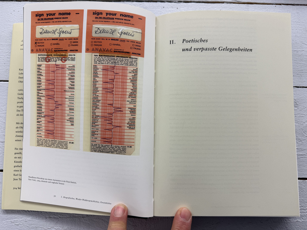 Spoerri reflektiert sein eigenes künstlerisches Umfeld, seine Begegnungen und biografischen Brüche mit ironischer Distanz und analytischer Schärfe. Die Anekdote fungiert dabei nicht als beiläufige Randnotiz, sondern als Erkenntnisform. Sie macht sichtbar, wie Kunstgeschichte, Alltag und persönliche Erfahrung ineinandergreifen und sich gegenseitig strukturieren.