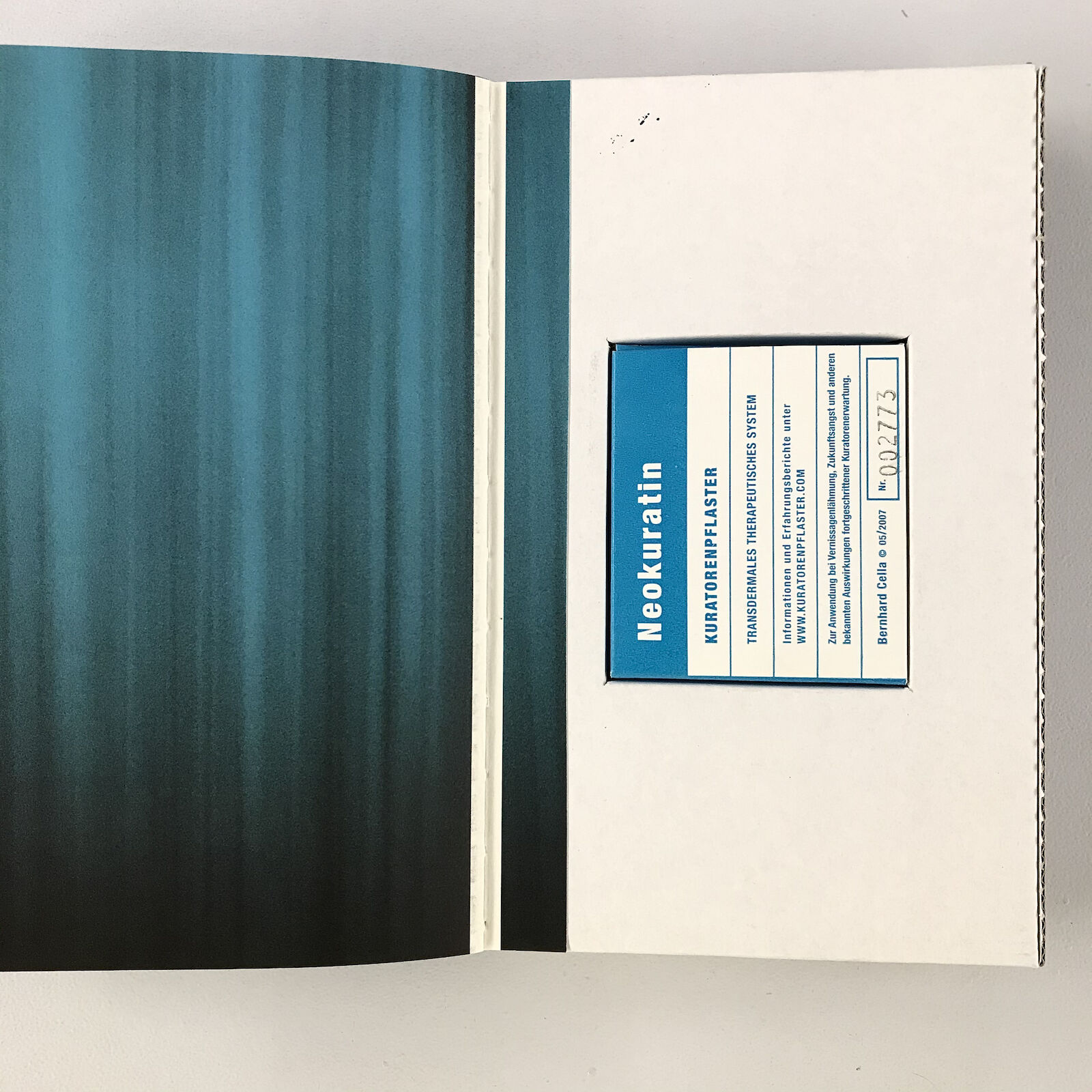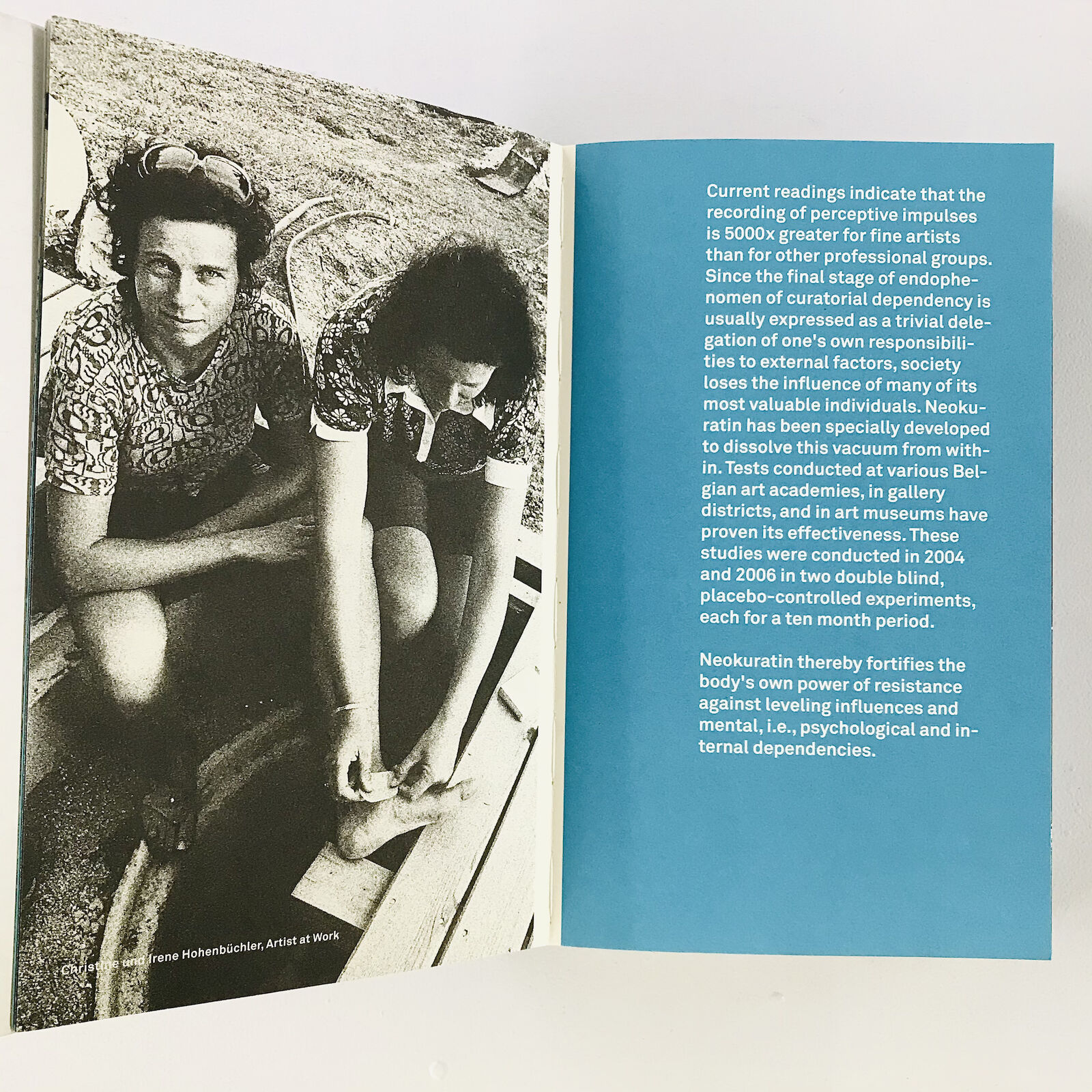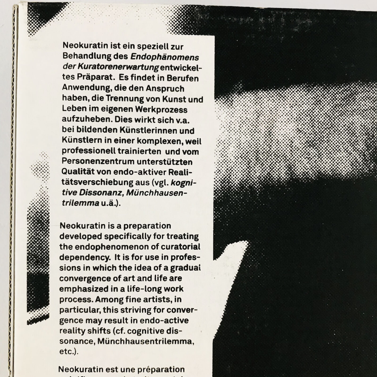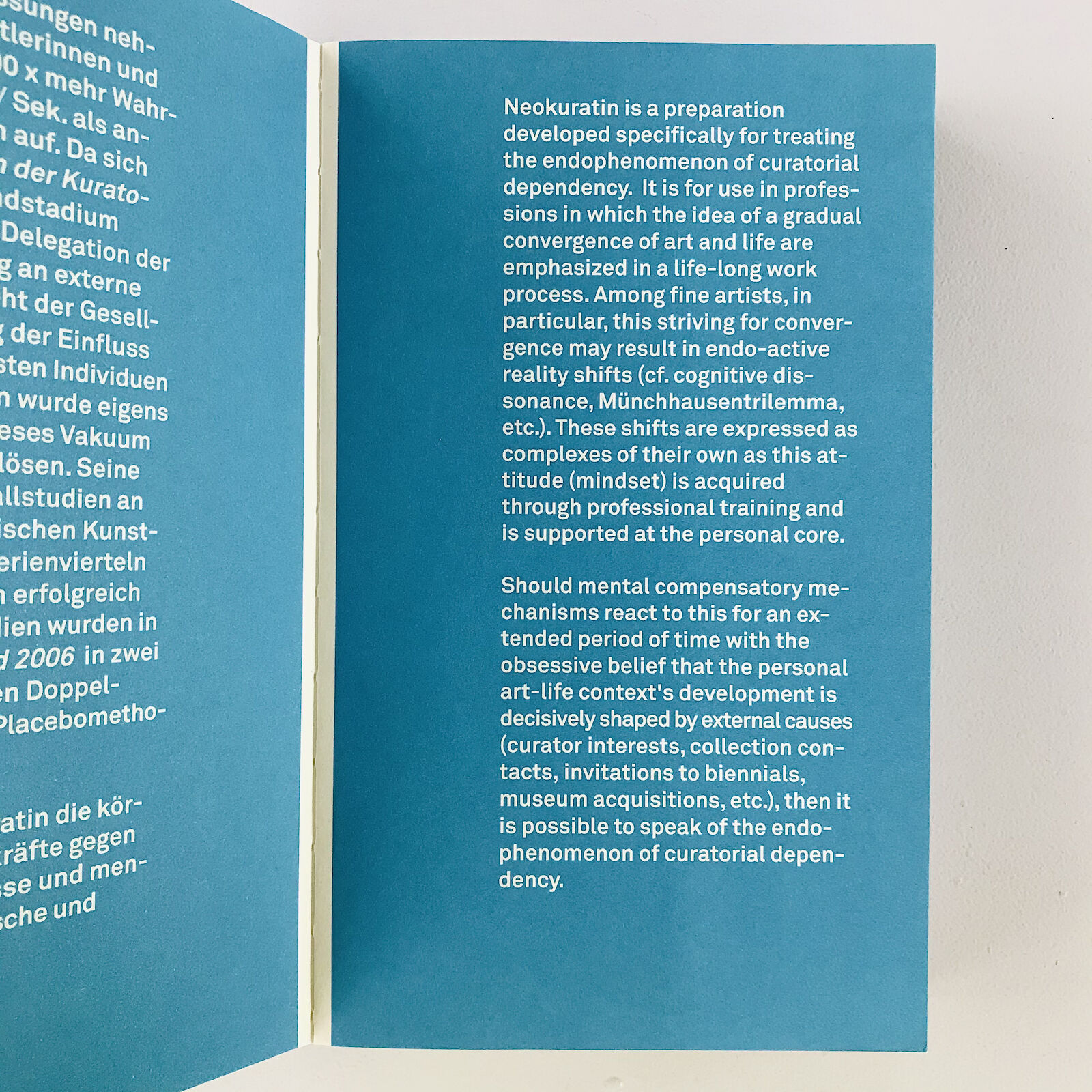 Through the neurotransmitter synapses of the amygdala (located in the medial sector of the temporal lobes), it indirectly affects the attunement of coordination of personal behavior. In contrast to sedatives, psychotropic drugs, and benzodiazepines, Neokuratin strengthens the magnitude of the patient’s own will and own ability to make decisions. Therefore, it is not experienced as an external psychological or physical effect, but as an inner aid to self estimation and self development. Neokuratin sensitizes the endo-active balance of the transmitters tymosin and stratosin. Their balance is essential for independent reaction to spontaneous first impressions (tymosin) with a simultaneous ability to devise plans irregardless of the situation (stratosin). It contributes greatly to keeping open the long-term recourse to previous works in an artistic work process (long-term coherence).Künstlerbuch mit integriertem Multiple. "Neokuratin" ist ein speziell zur Behandlung des Endophänomens der Kuratorenerwartung entwickeltes Präparat.