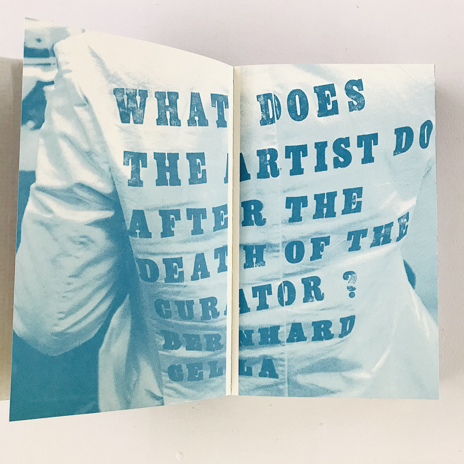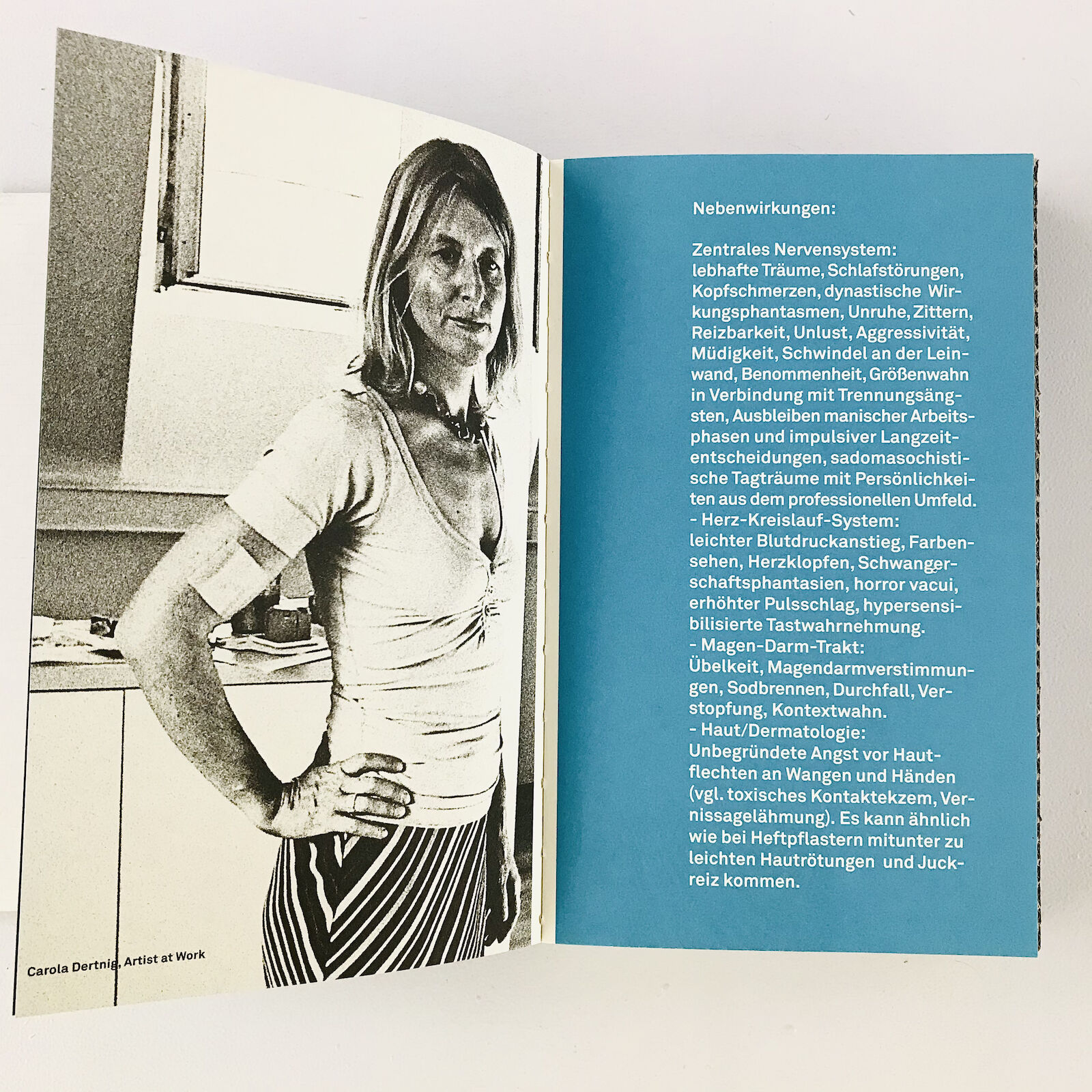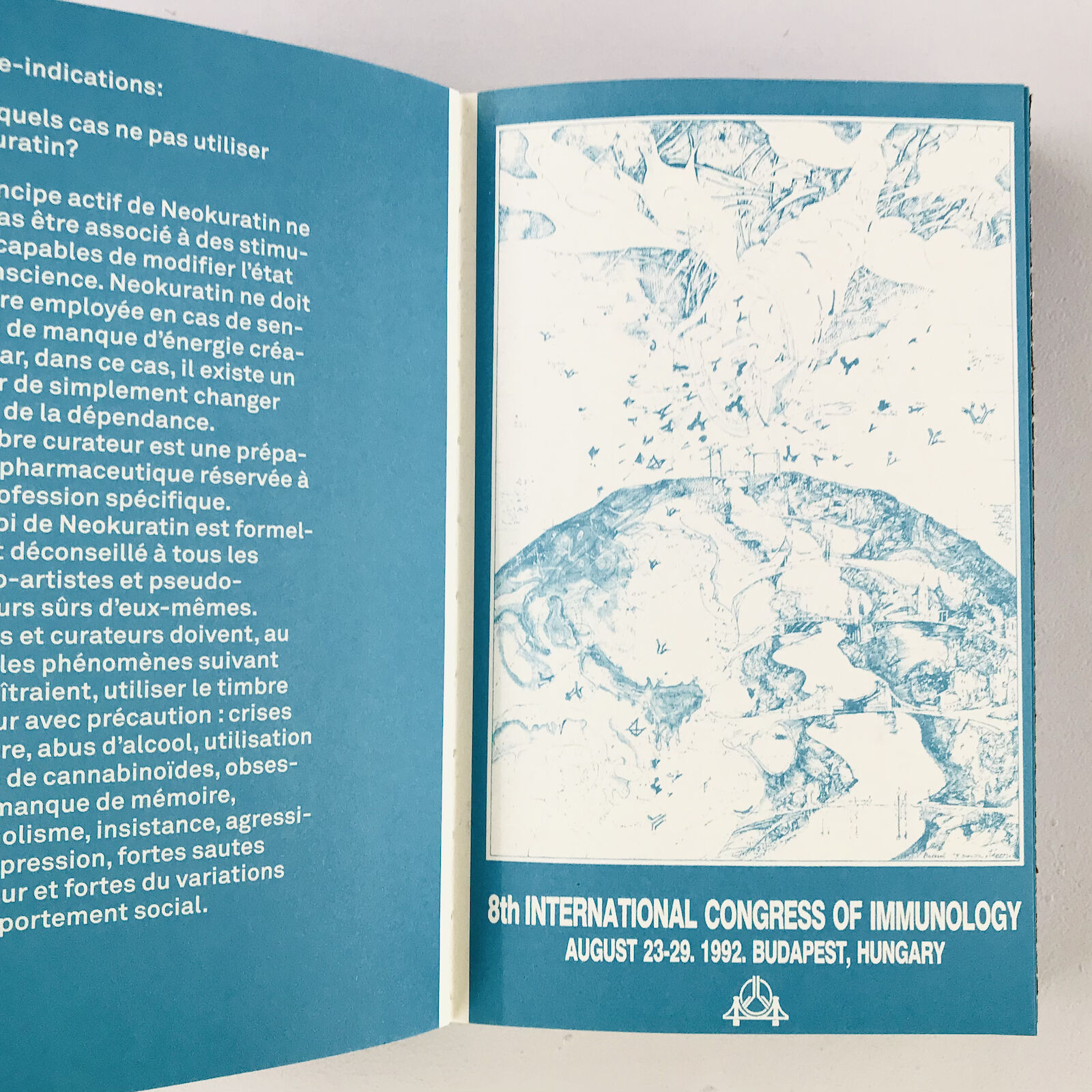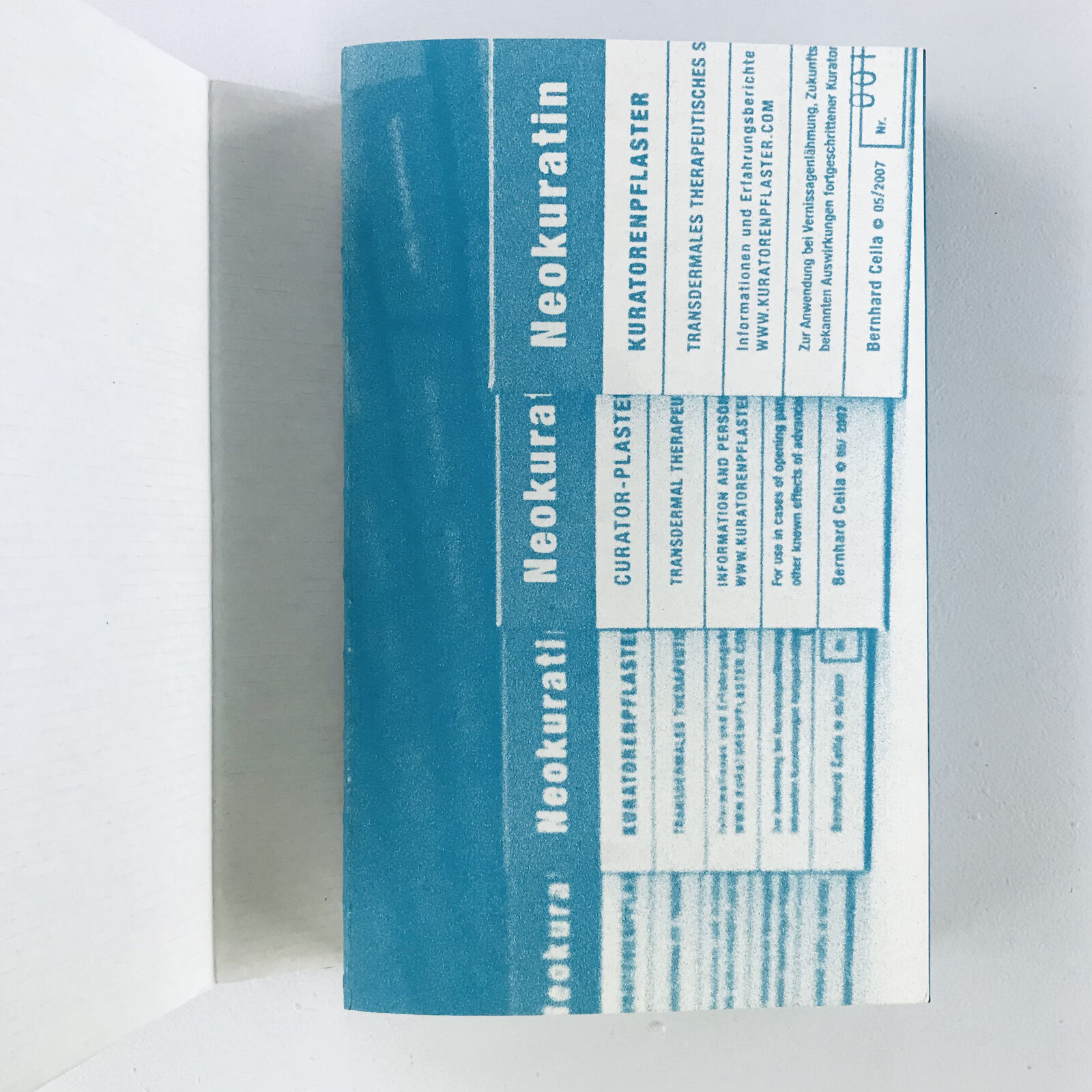 Through the neurotransmitter synapses of the amygdala (located in the medial sector of the temporal lobes), it indirectly affects the attunement of coordination of personal behavior. In contrast to sedatives, psychotropic drugs, and benzodiazepines, Neokuratin strengthens the magnitude of the patient’s own will and own ability to make decisions. Therefore, it is not experienced as an external psychological or physical effect, but as an inner aid to self estimation and self development. Neokuratin sensitizes the endo-active balance of the transmitters tymosin and stratosin. Their balance is essential for independent reaction to spontaneous first impressions (tymosin) with a simultaneous ability to devise plans irregardless of the situation (stratosin). It contributes greatly to keeping open the long-term recourse to previous works in an artistic work process (long-term coherence).Künstlerbuch mit integriertem Multiple. "Neokuratin" ist ein speziell zur Behandlung des Endophänomens der Kuratorenerwartung entwickeltes Präparat.