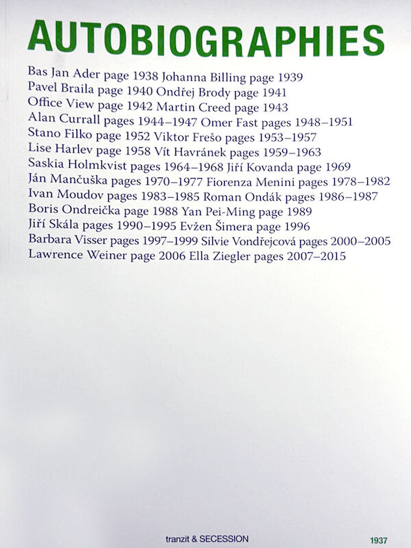 Autobiographies was published in 2006 by Revolver, tranzit, and the Vienna Secession. The publication accompanied a series of exhibitions developed in three “acts”: I Narrow Focus at tranzit in Bratislava, I Já at Futura Gallery in Prague, and Ich I Performative Ontology at the Vienna Secession. The catalogue was edited by Vít Havránek and Vjera Borozan and brings together artistic positions concerned with the construction, staging, and instability of the self.