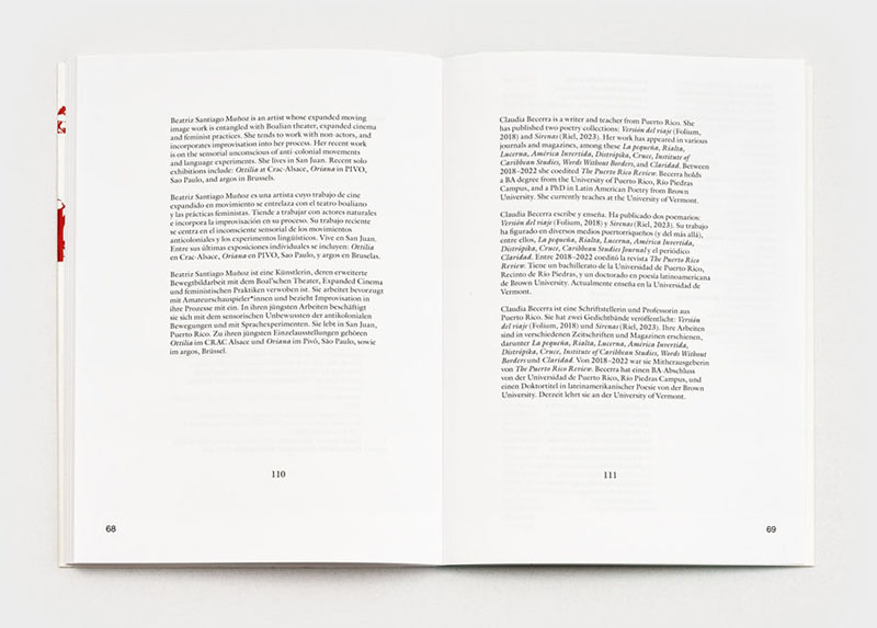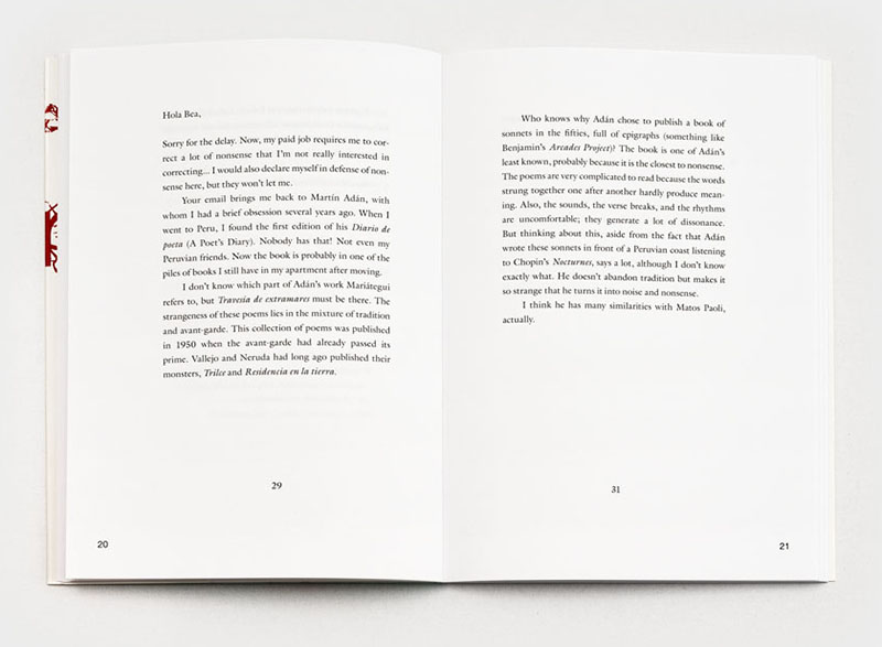 Their dialogue revolves around the notion of nonsense and the practice of jitanjáforas, allowing themselves to drift through free association while resisting the impulse to impose fixed form or meaning. At the core of this exchange are excerpts and poems by Latin American authors such as Clarice Lispector, Alfonso Reyes, Alejandra Pizarnik, Mariano Brull, Francisco Matos Paoli, César Vallejo, José Carlos Mariátegui, Martín Adán, and Bobby Capó. Their texts appear as a detachable booklet within the book, shaping the structure and tone of the artistic intervention.