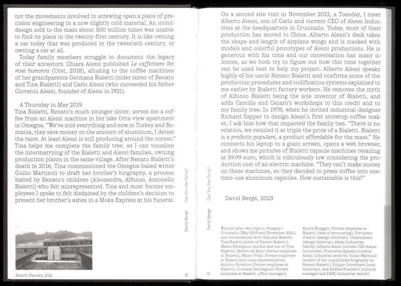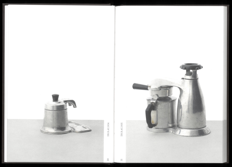 appropriated the family brand, industrialized the production of stovetop coffee makers in the early 1950s, and sold roughly 300 million pots worldwide. Producing clones of his produc to beat competitors, the controversial entrepreneur Renato Bialetti did not deem keeping records, prototypes, or archives necessary. In this void, artist David Bergé began gathering Bialetti machines near the factory in ruins, at second-hand markets, and in flagship stores. This book is Bergé’s proposal of a Bialetti catalogue. It provides insights into the production process of a piece of precision engineering, nourished by the voices of members of the industrialist’s family, as well as former factory workers, and union representatives: Bialetti, a twentieth century icon, no longer part of every kitchen today.