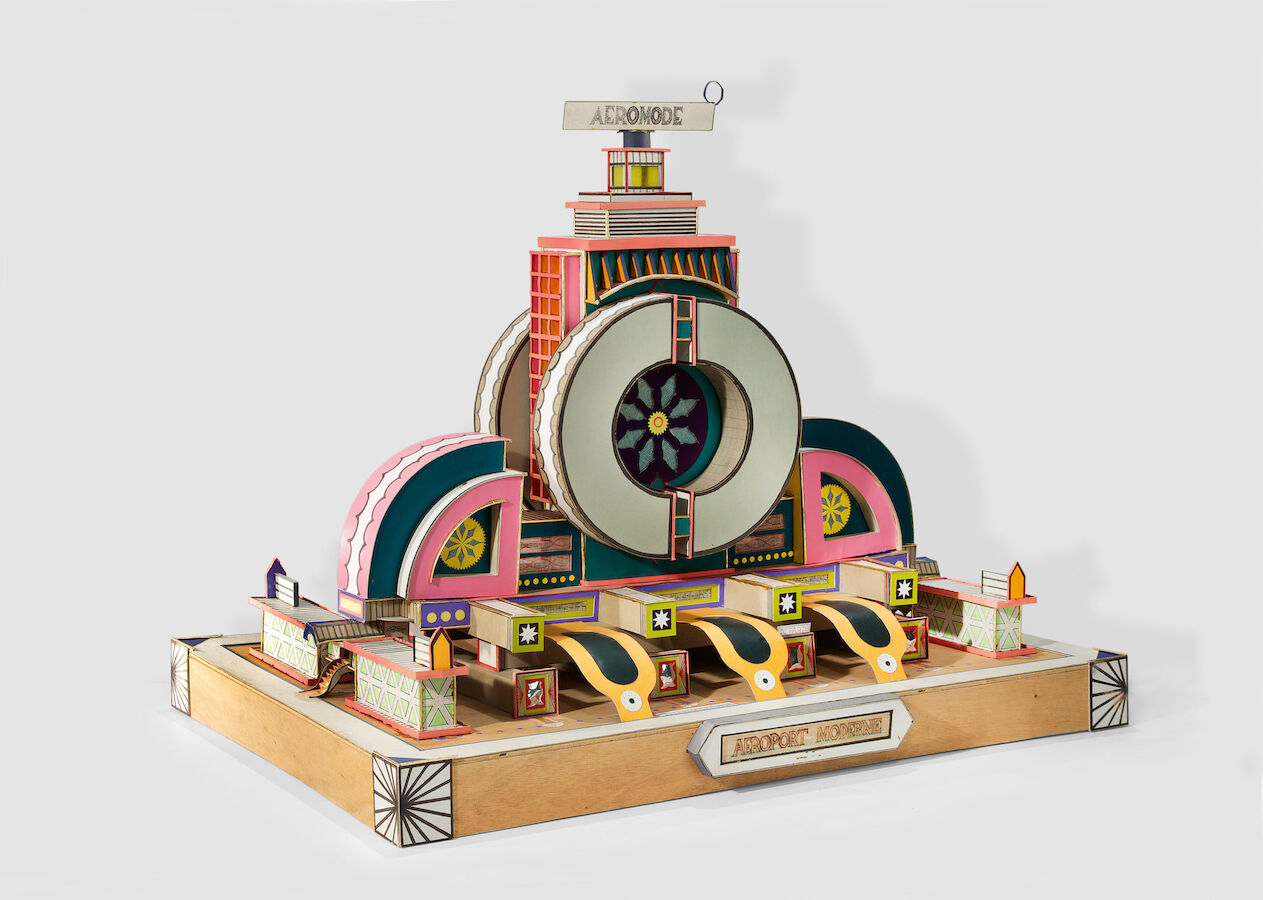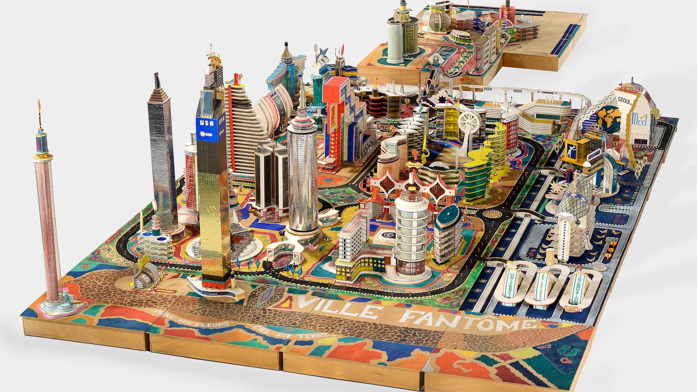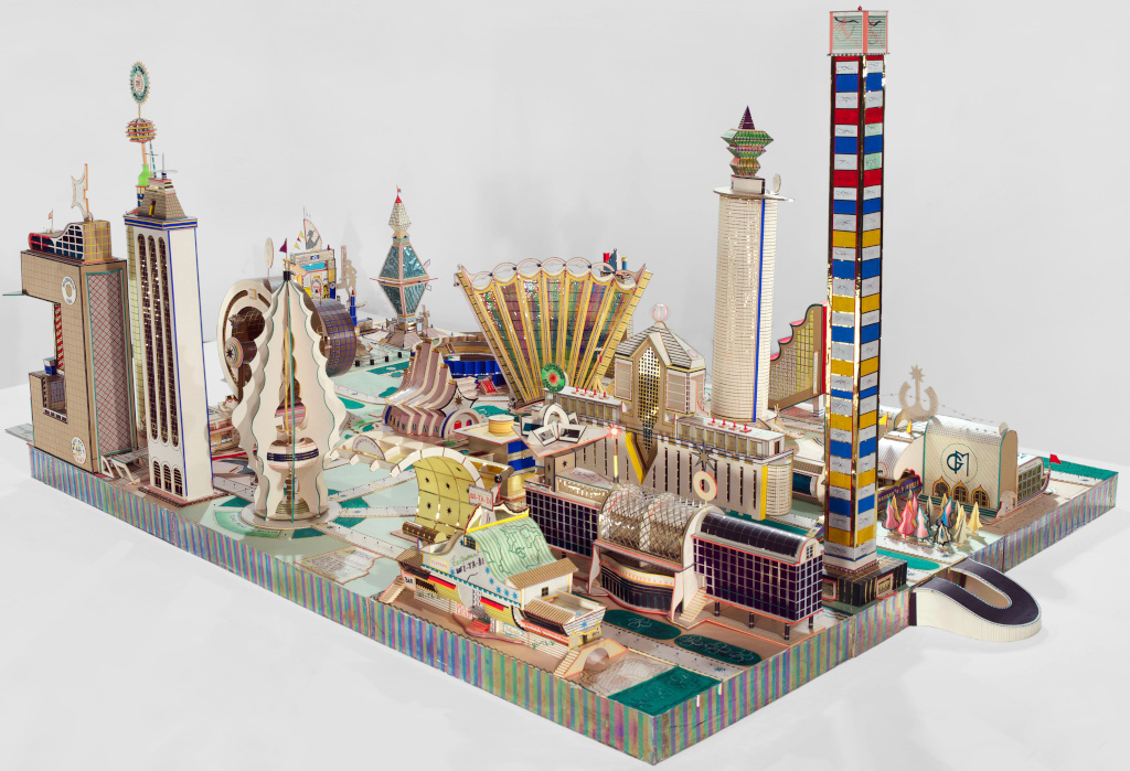 The sculptures of Bodys Isek Kingelez (1948–2015) are imagined architectural propositions and improbable structures for a fairytale urban landscape. Comprised of paper, commercial packaging and the stuff of everyday life, his “extreme maquettes” transform these materials into fantastic visions that encompass civic buildings, public monuments and private pavilions.