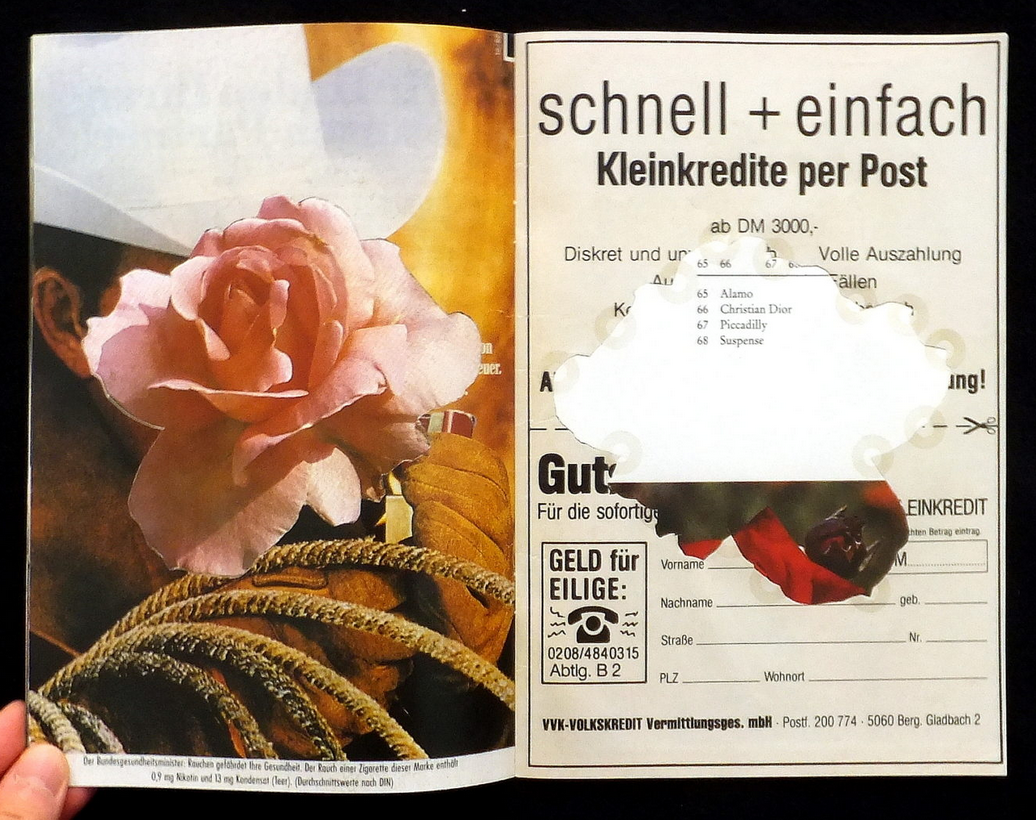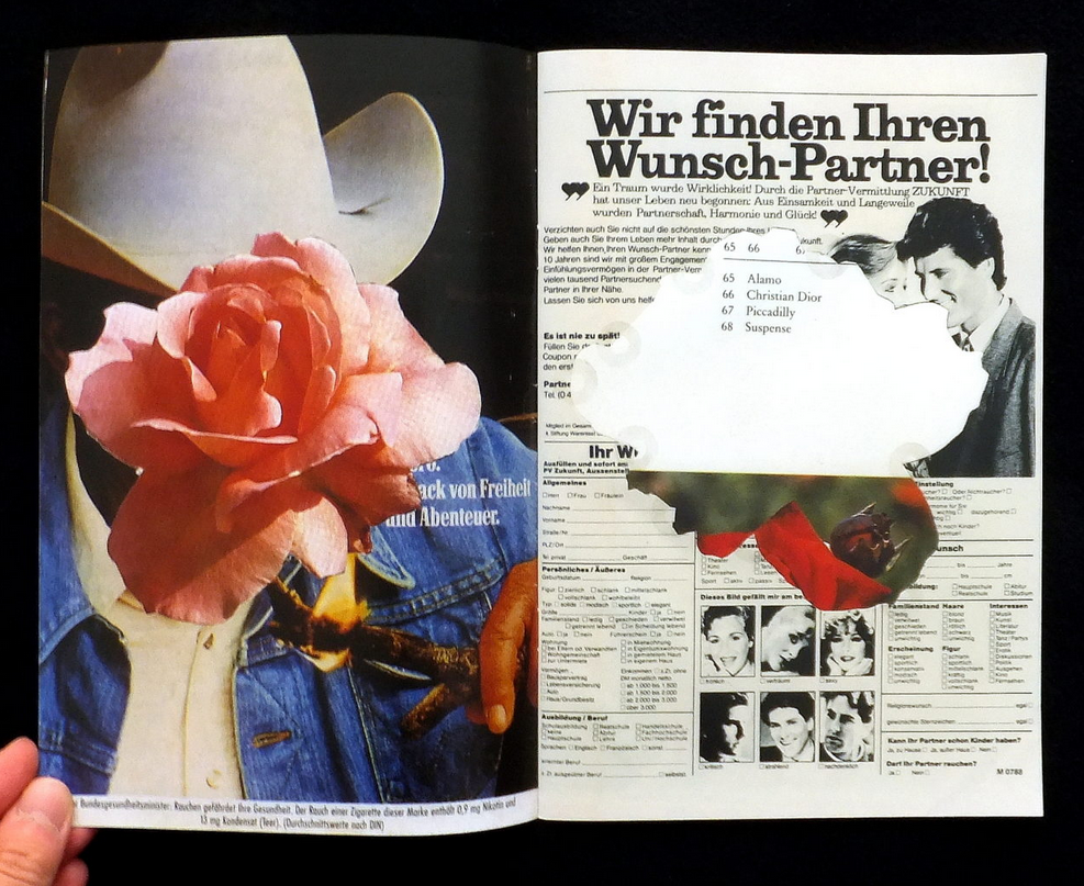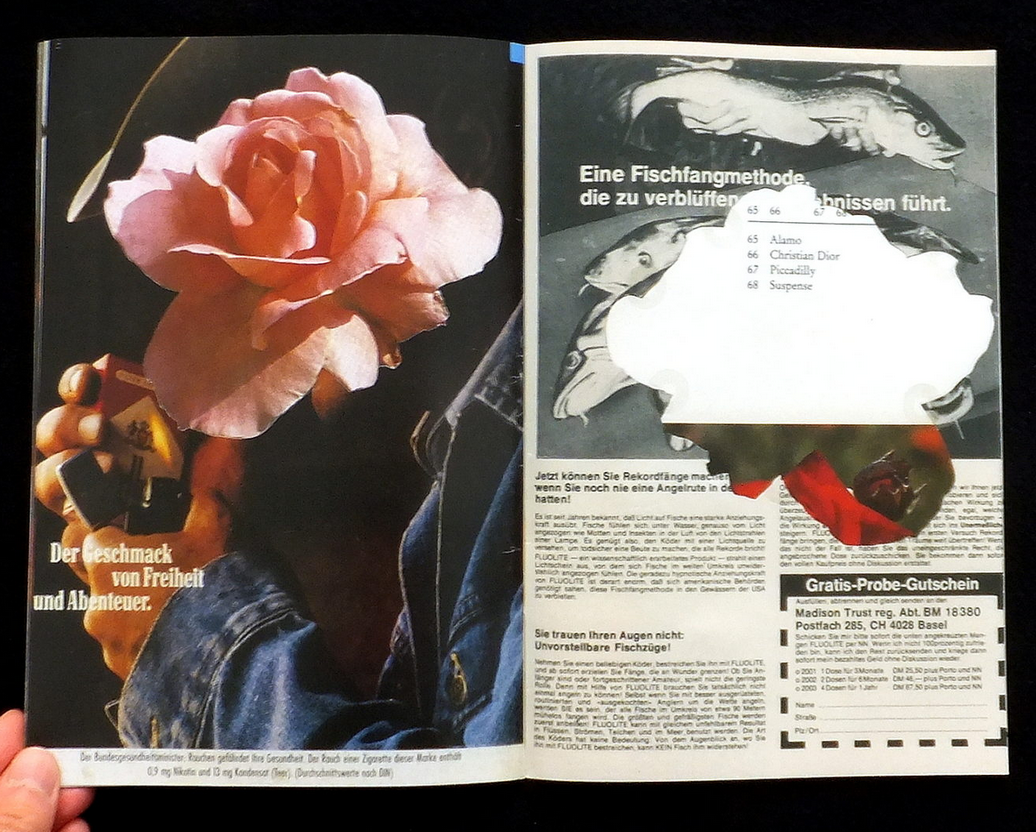 The publication features 24 full-page reproductions of magazine advertisement pages, whose mundane familiarity is disrupted by cut-outs and collages.
