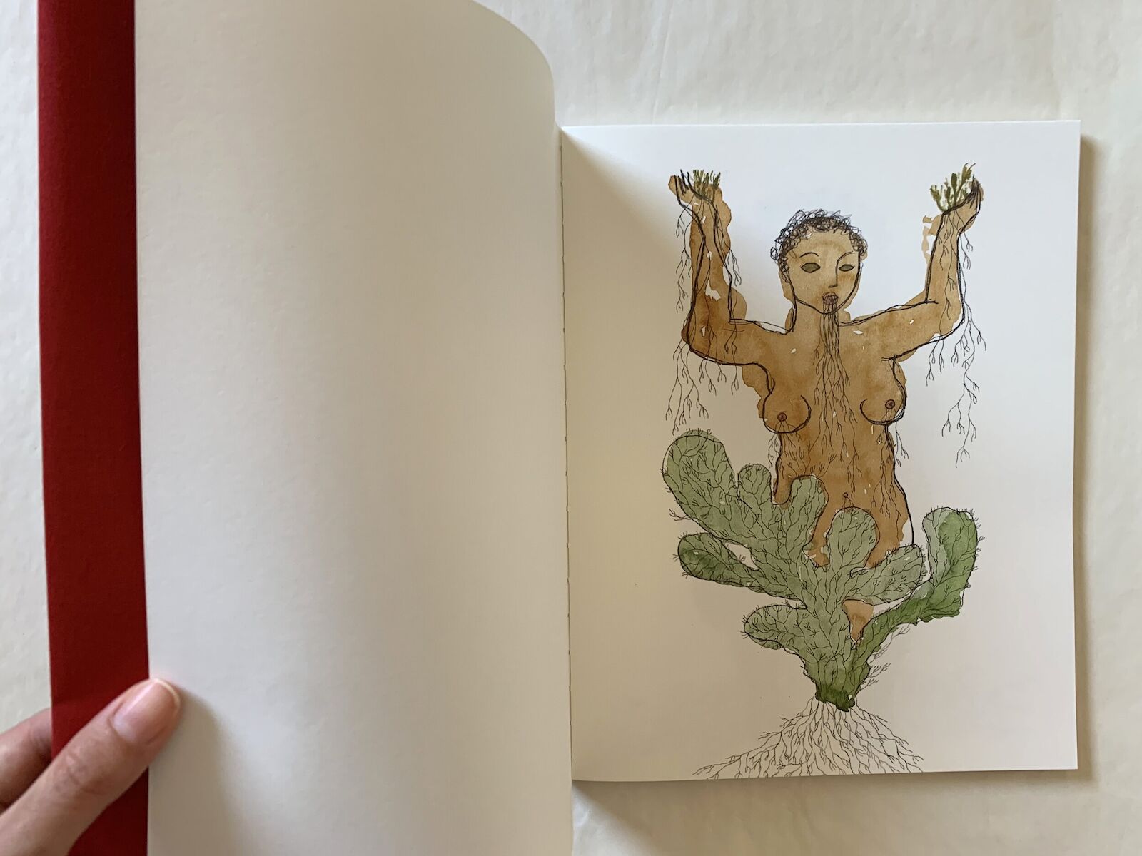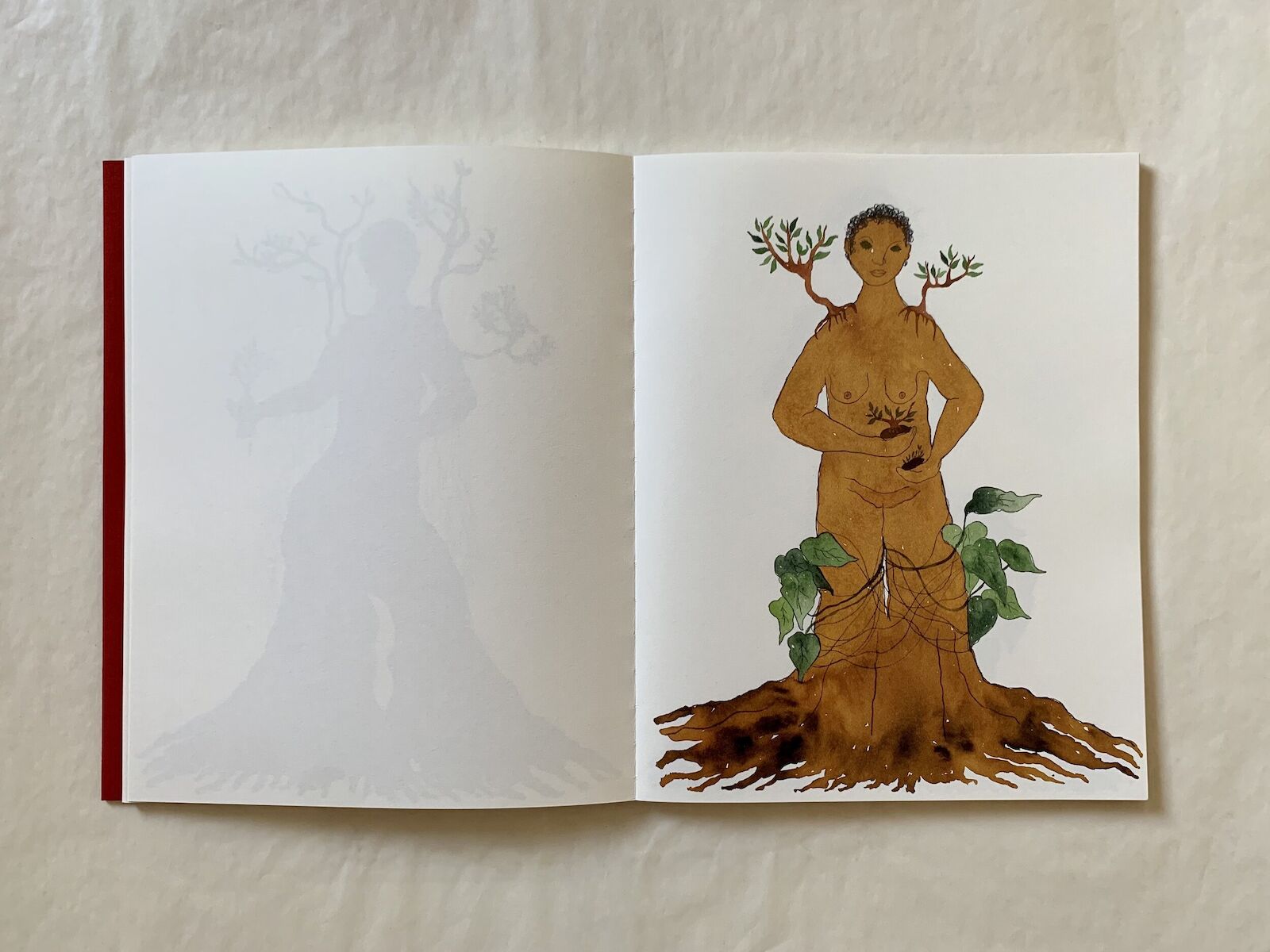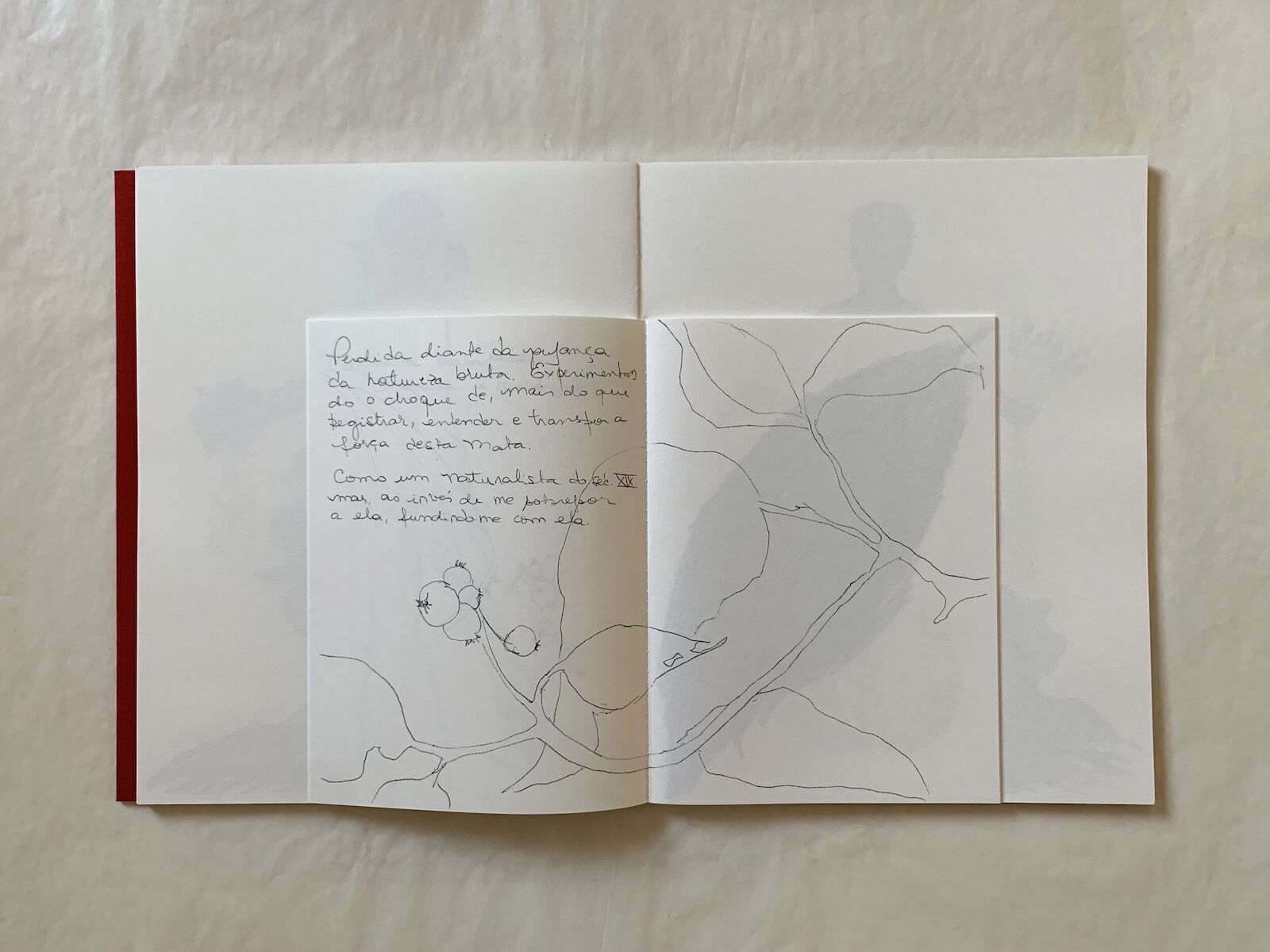 We all identify with or would love to be like the Buffalo and Lady of Plants, and the book allows us to slowly discover (ourselves in) these women. Turning the pages, we find between them one of the notebooks that the artist fills in on her daily walks through the parks around her home. Rosana needs to feel on her skin the strength of the Atlantic Forest, the humid air and the sound of nature. These drawings, rescued in one of the book's creative process meetings, are the seed of the two feminine archetypes presented in this edition. They reflect the artist's attempt to merge with the natural world and remind us of our proximity to it: seeds and fruits are like our sexual organs, roots and branches are like arms, legs, or our respiratory system. We are part of and side by side with nature, never above it.