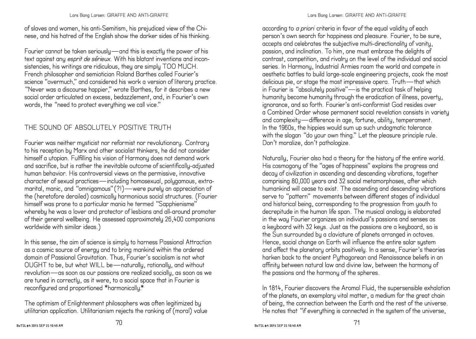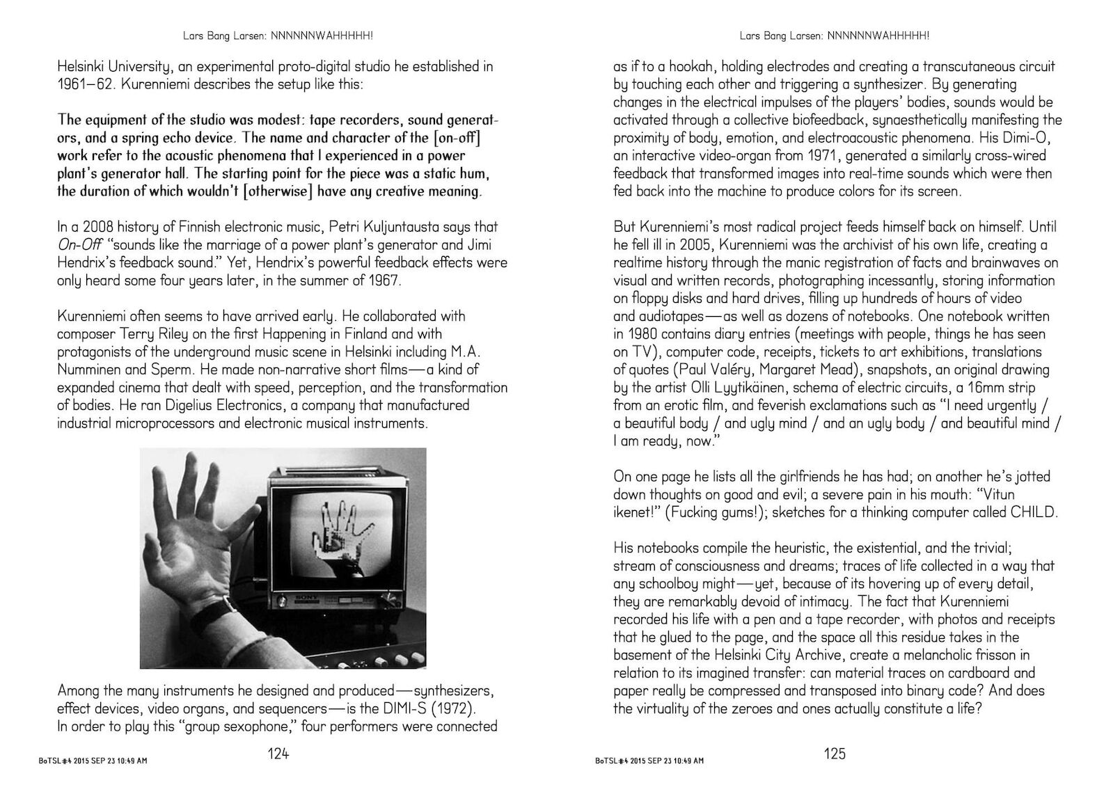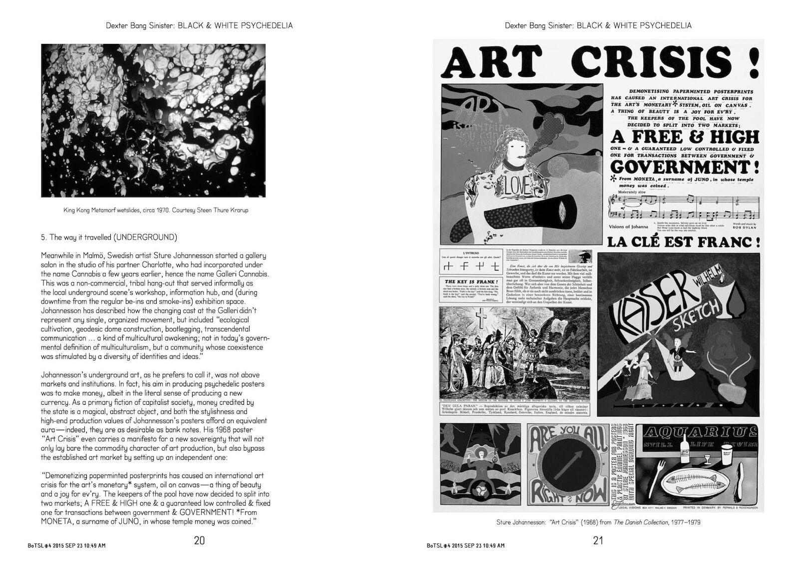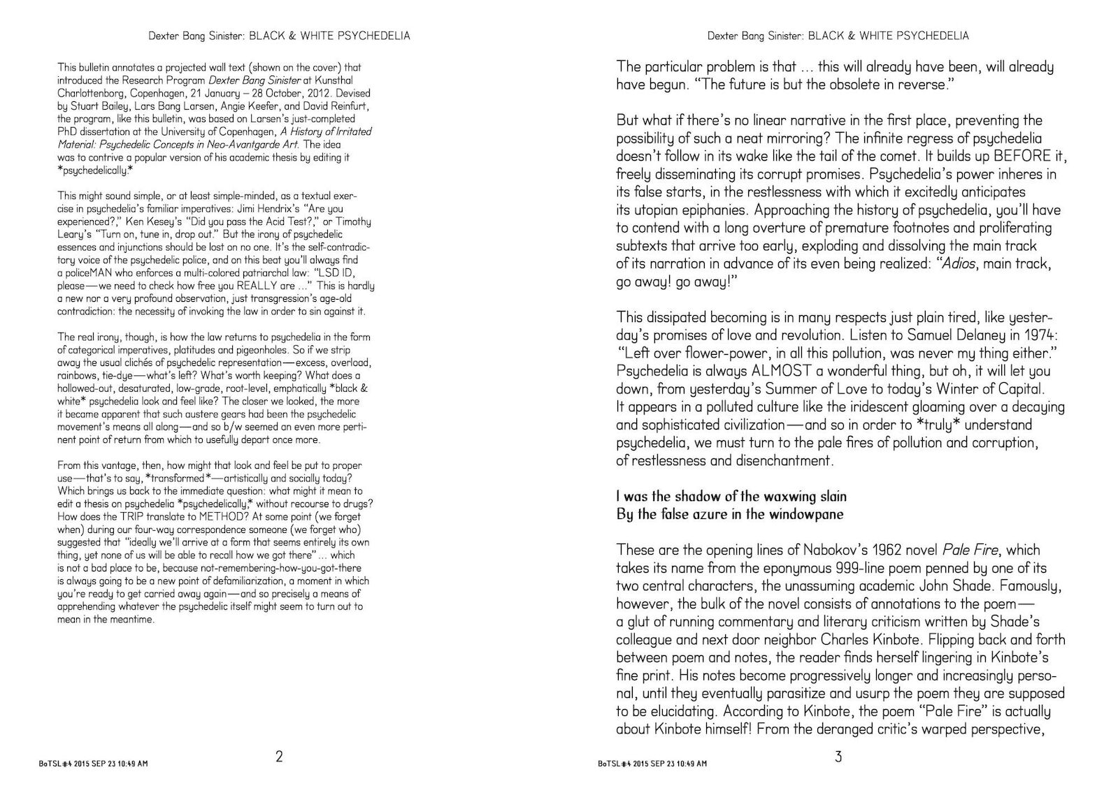 Devised by Stuart Bailey, Lars Bang Larsen, Angie Keefer, and David Reinfurt, the program, like this bulletin, was based on Larsen’s just-completed PhD dissertation at the University of Copenhagen, A History of Irritated Material: Psychedelic Concepts in Neo-Avantgarde Art. The idea was to contrive a popular version of his academic thesis by editing it psychedelically.