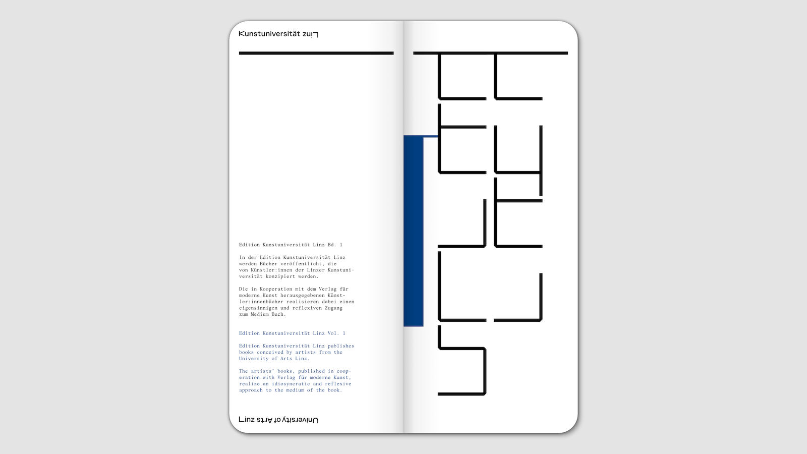 Edition Kunstuniversität Linz, Vol. 1: The Edition Kunstuniversität Linz publishes books conceived by artists from the University of Arts Linz. Produced in collaboration with Verlag für moderne Kunst, these artists’ books adopt an idiosyncratic and reflective approach to the medium of the book.