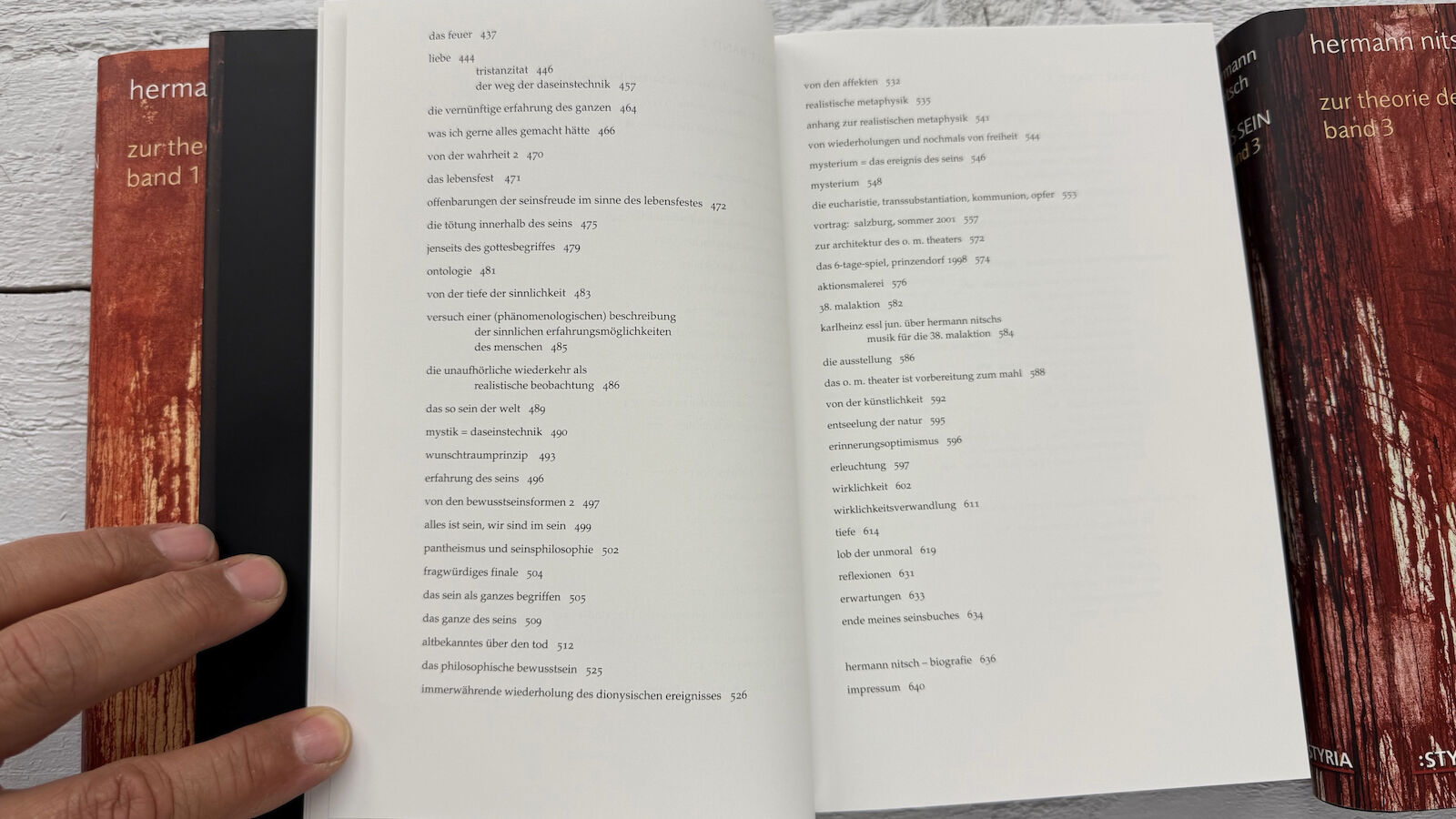 die immer wieder auch in jenen nach dem Woher und Wohin münden, stehen seit jeher im Zentrum der Arbeit von Hermann Nitsch. Nicht nach richtig und falsch fragt er und nicht nach gesellschaftlich relevant, erlaubt oder verboten, sondern ausschließlich danach, worin die Intensität des Existierens besteht. Nitsch setzt sich in diesem Zusammenhang sowohl mit den Philosophen des Abendlandes auseinander als auch mit Hinduismus und Buddhismus, analysiert Mystik und Religion. Zur Verdeutlichung und Vertiefung seiner über Jahrzehnte weiterentwickelten Philosophie verwendet Nitsch immer wieder auch sein dichterisches Œuvre.