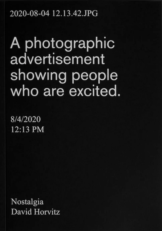 In Nostalgia, the book itself becomes a space for temporal experience. Reading turns into a performative act, where meaning emerges through rhythm, sequencing, and silence. The publication aligns with Horvitz’s broader practice, in which circulation, time, and the everyday are used to question how art, memory, and attention operate within contemporary life. If you want, I can shorten this to a catalogue blurb, adapt it for a publisher’s website, or tune the tone to something more academic or more poetic.