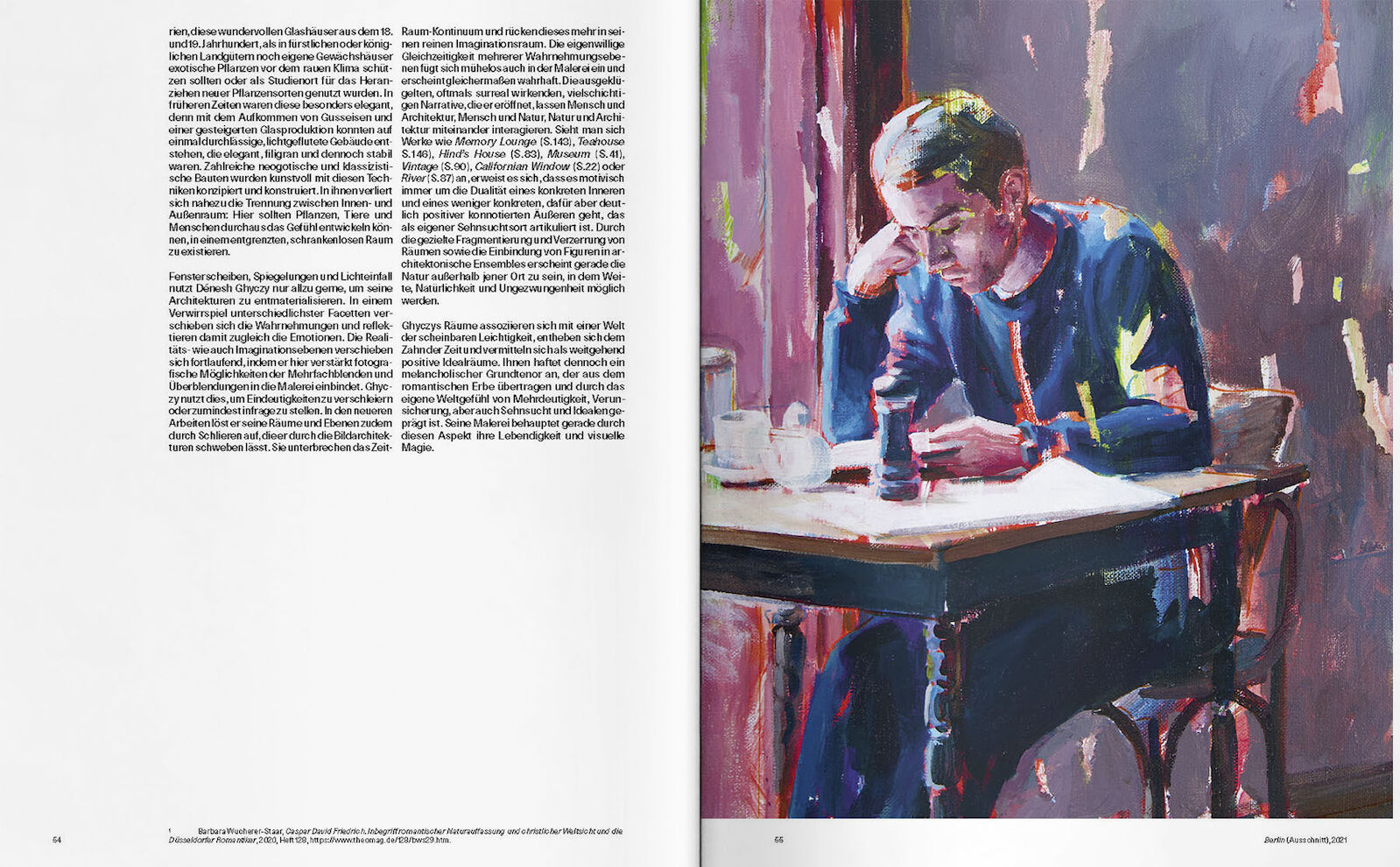 Between a past life in the metropolis and a new studio existence in a rural setting, a dialogue unfolds – about art, space, light, relationships, and solitude, but also about spirituality, authenticity, and the search for lightness. Ghyczy’s painting, known for its silent figures and architectural spaces, moves between photorealism and painterly openness, between withdrawal and resonance. His works address the human being in the world – lost, connected, observant – and raise existential questions about happiness, closeness, and self-perception.