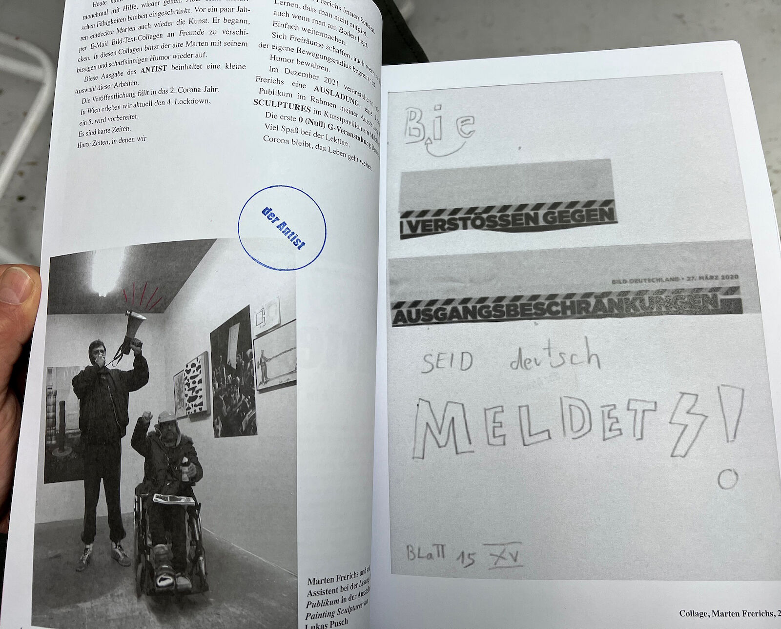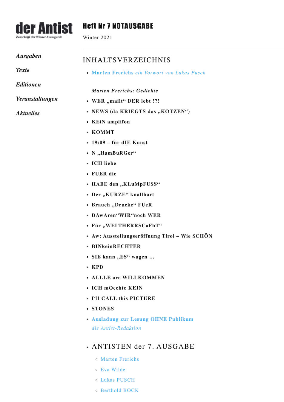 Diese Ausgabe des ANTIST beinhaltet eine kleine Auswahl dieser Arbeiten. Die Veröffentlichung fällt in das 2. Corona-Jahr. In Wien erleben wir aktuell den 4. Lockdown, ein 5. wird vorbereitet. Es sind harte Zeiten. Harte Zeiten, in denen wir von Marten Frerichs lernen können. Lernen, dass man nicht aufgibt, auch wenn man am Boden liegt. Einfach weitermachen. Sich Freiräume schaffen, auch wenn sie klein sind und der eigene Bewegungsradius begrenzt ist. Humor bewahren.