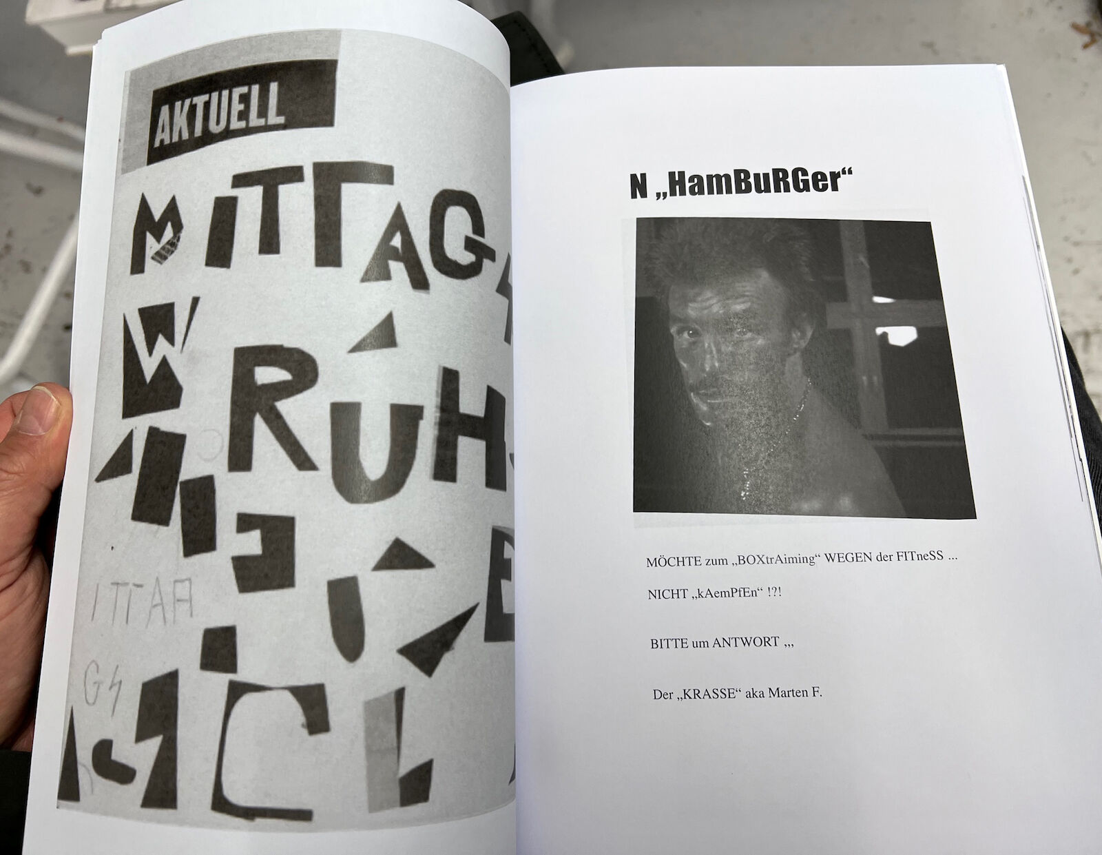 Das ist jetzt 15 Jahre her. Heute kann Marten wieder reden und, wenn auch manchmal mit Hilfe, wieder gehen. Aber seine motorischen Fähigkeiten blieben eingeschränkt. Vor ein paar Jahren entdeckte Marten auch wieder die Kunst. Er begann, per E-Mail Bild-Text-Collagen an Freunde zu verschicken. In diesen Collagen blitzt der alte Marten mit seinem bissigen und scharfsinnigen Humor wieder auf.