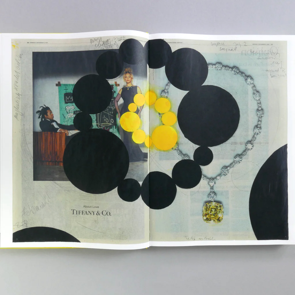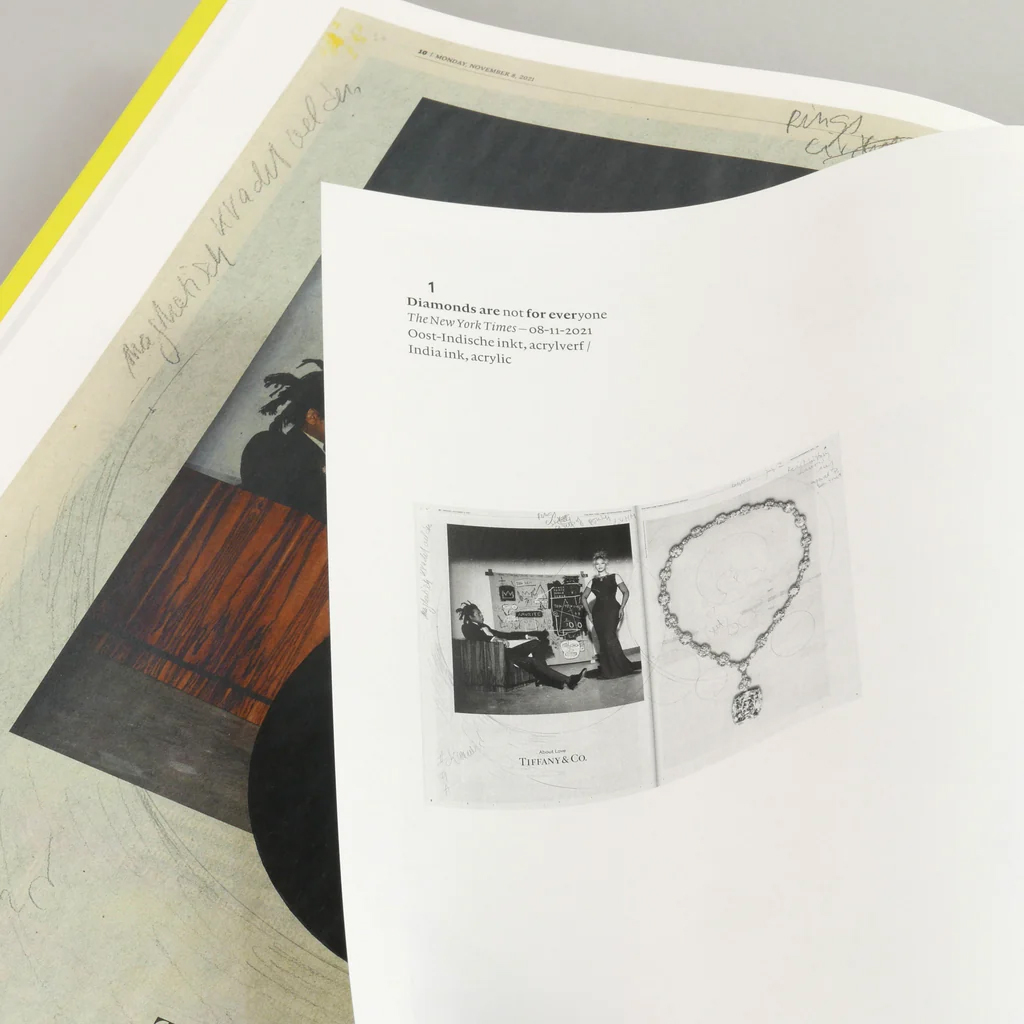 He paints, draws, applies gold leaf to the pages or manipulates the paper. The works express a great curiosity about and involvement with the world. Recurrent themes include space, science, faith, violence, racism and geopolitics. The series tells the story of the artist – and how he relates to a rapidly changing world during the years surrounding the millenium transition.
