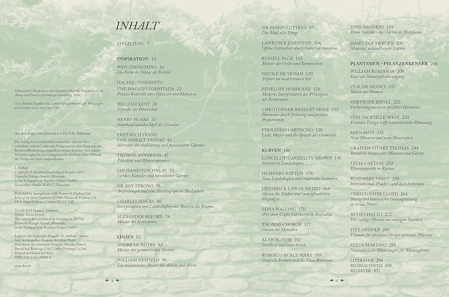 Menschen gestaltet, die nicht nur den Zeitgeist vertreten, sondern vor allem aus ganz persönlichen Gründen dem Thema Garten ihre Handschrift verleihen wollen. Doch wer sind diese Gestalter, die hinter den geschaffenen Werken stehen, die uns heute noch beeindrucken? Unser Buch zeigt, wie aus ganz unterschiedlichen Lebenshintergründen kulturelle Meisterwerke wie Versailles, Wörlitz, der berühmte englische Landschaftsgarten von Stourhead oder der New Yorker Central- und der High-Line-Park entstanden. Die Spanne ist groß und reicht von adeligen Amateurgärtnern über innovative Gärtner und Pflanzenliebhaber, professionell ausgebildete Designer bis zu Malern, Bildhauern und Architekten. Wir erhalten einen Einblick in das Leben und Wirken von 40 berühmten Gestaltern aus 13 Ländern und 5 Jahrhunderten, wie William Kent, André Le Nôtre, Edwin Lutyens, Gertrude Jekyll, Roy Strong, Christopher Bradley-Hole, Roberto Burle Marx, James van Sweden, Piet Oudolf und vielen anderen mehr.