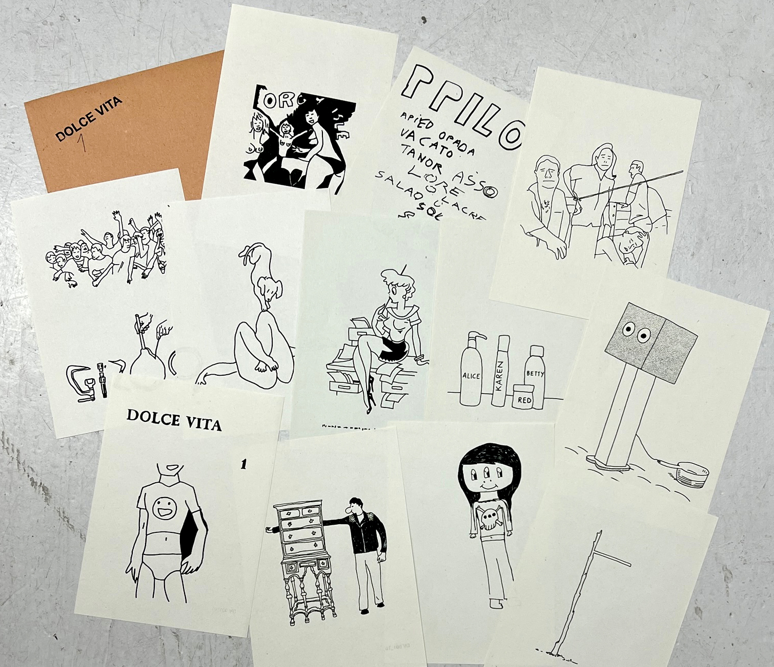 12 individual sheets with prints of drawings.