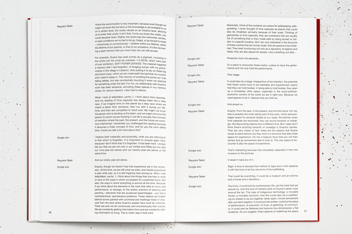 knowledge, representation, and value imposed by settler colonialism. The exhibition is accompanied by a publication featuring an essay by curator Damian Lentini and a conversation between curator Eungie Joo and artist Rayyane Tabet. The artistic intervention employs sumac powder, a pigment Duane Linklater uses in his paintings and disperses throughout the book, where it unfolds as a sensory substance that activates spaces of memory.