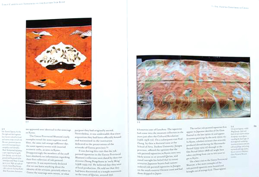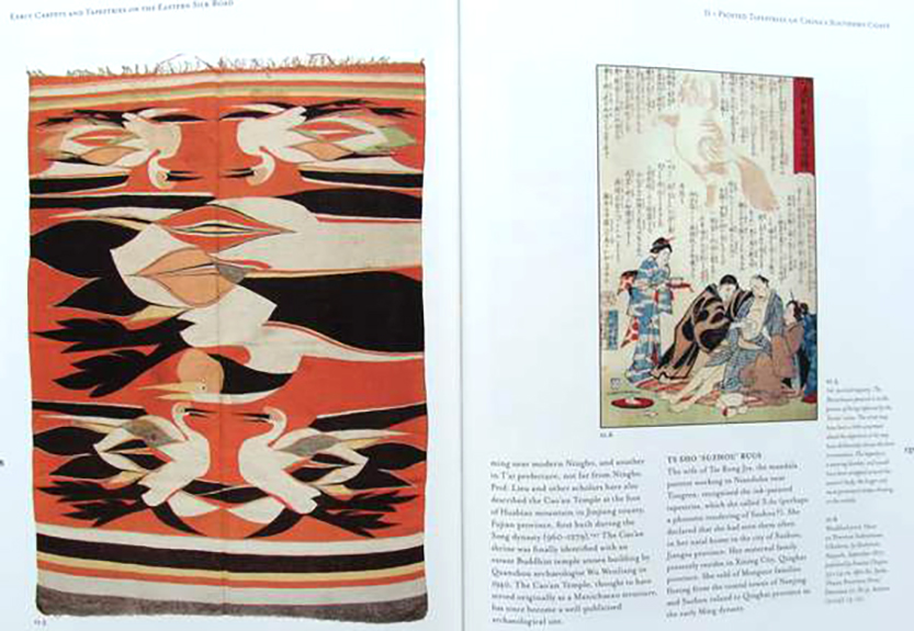 Early Carpets and Tapestries on the Eastern Silk Road is written by Gloria Granz Gonick, Art Historian and Research Associate at The Fowler Museum at UCLA, former Guest Curator for Matsuri Japanese Festival Arts, and former Museum Curator for the Los Angeles Craft and Folk Art Museum. She has studied the collections and their intriguing past over the past two decades during multiple research visits to China and Japan. The sites in Asia where the carpets and tapestries were created centuries ago, and over two hundred exemplary artworks have been photographed in color, and documented for this fascinating volume.