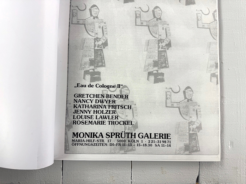 An early issue includes excerpts from an interview with Ingrid Sischy conducted by Monika Sprüth in New York in September 1985. The conversation situates contemporary artistic production within broader questions of media visibility, institutional critique and the changing relationship between artists, galleries and international art discourse.