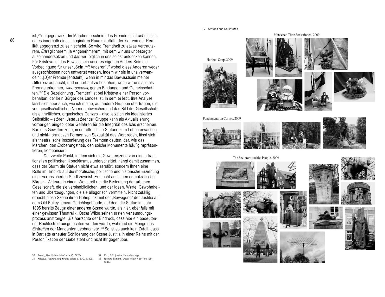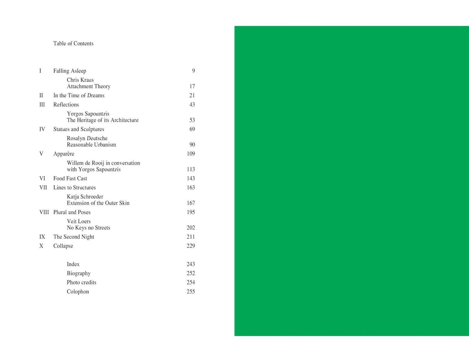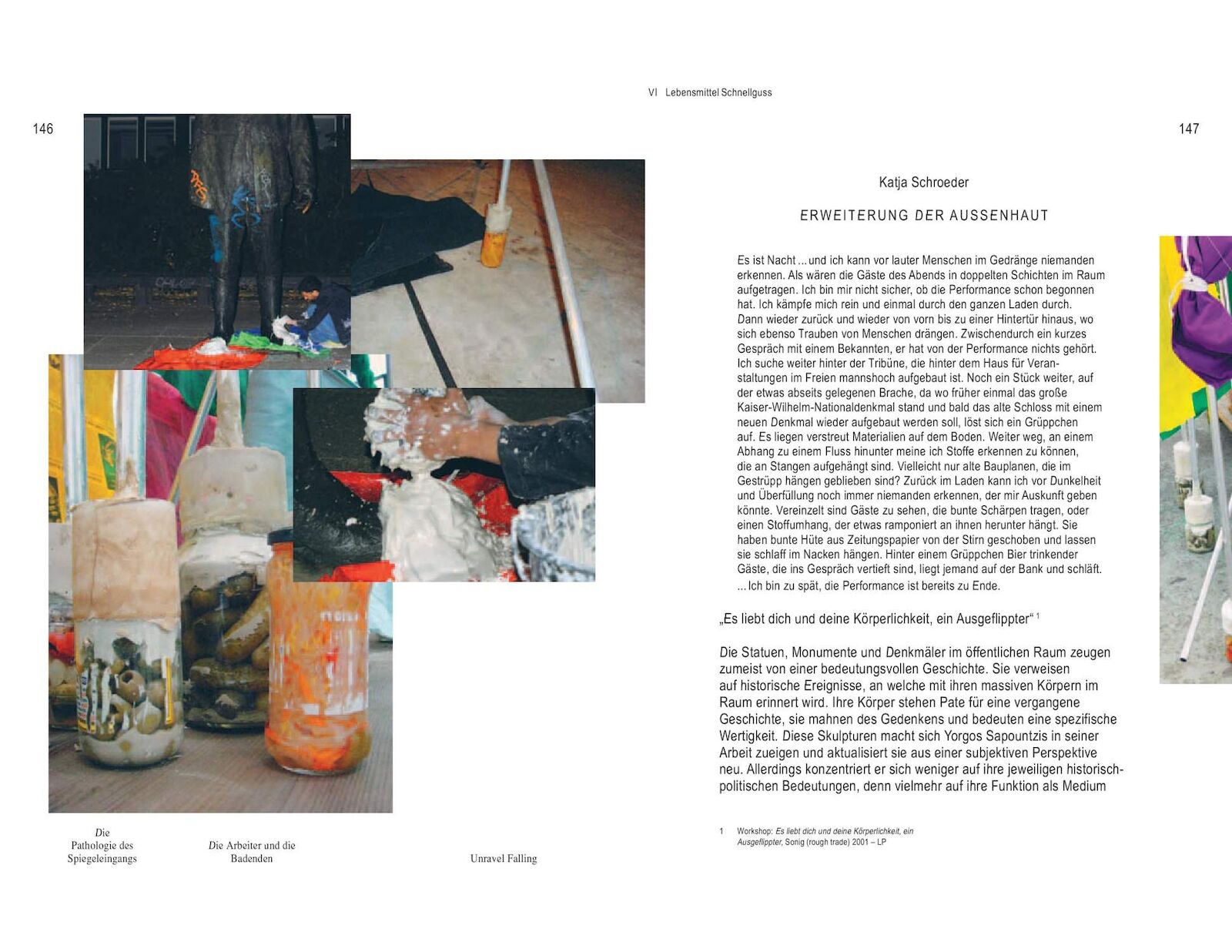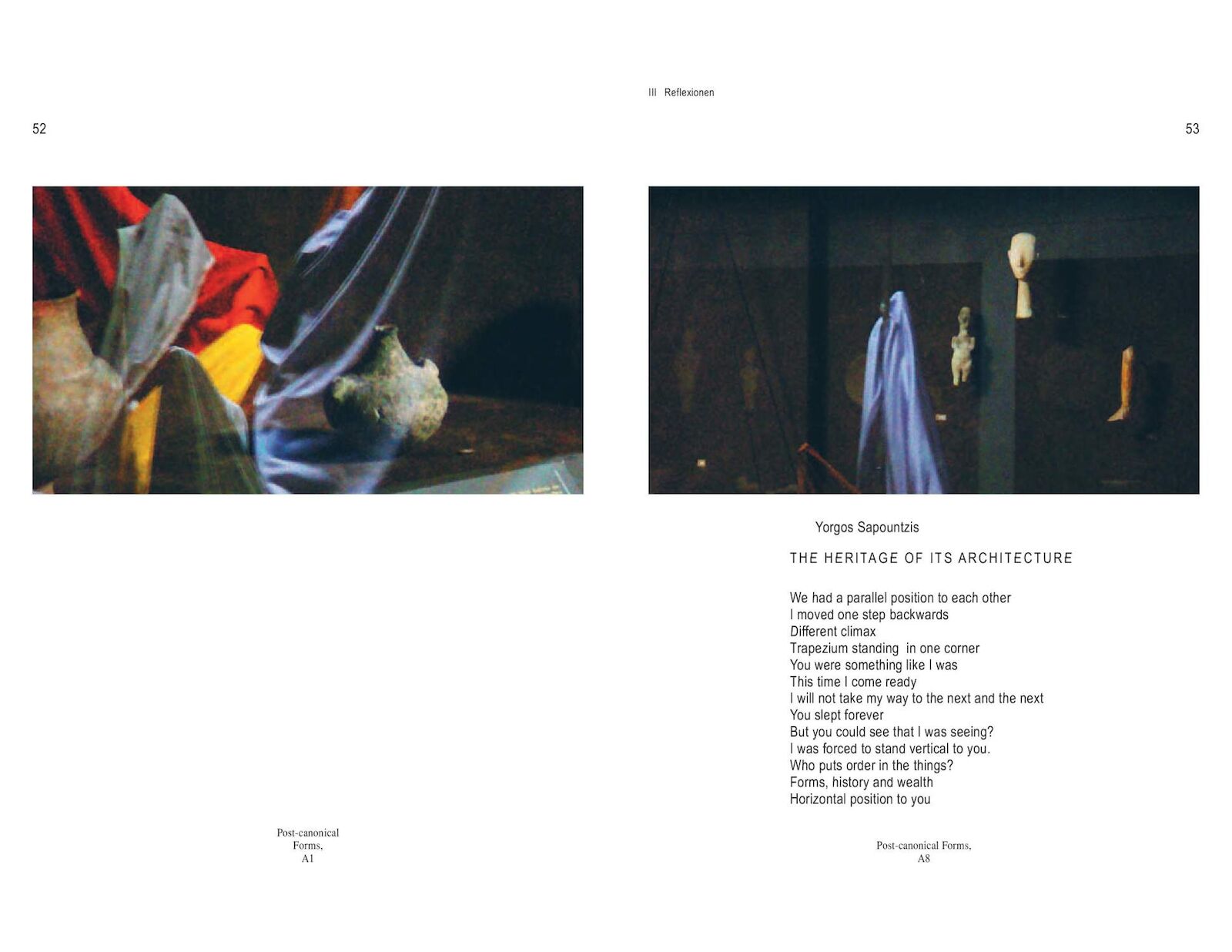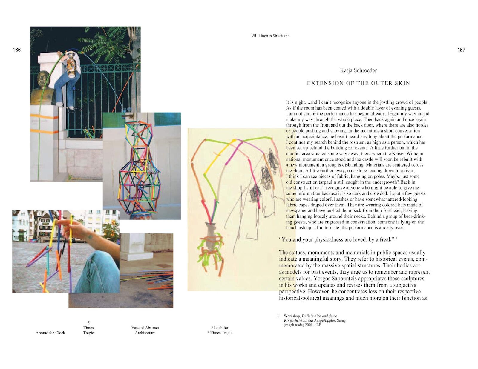 The Athens-born artist concentrates less on their historical-political meanings and much more on their function as a medium of recollection. Sapountzis consciously tries to ignore historical information about the sculptures and instead allows them to “speak” through their gestures, poses, and ornaments. Like an anthropologist—or parasite—Sapountzis hunts the urban, figurative myths by night or sounds them out for days on end with his camera. He then stages a confrontation, a dialogue, and a “dance,” in which the preceding expedition is consolidated to form a theatrical choreography. Sapountzis drapes scarves, makes plaster casts, and builds constructions out of aluminum rods and tape, ensnaring his stone or bronze protagonists, whom he tries to involve in his seemingly futile, exhausting activities. His video camera also records this action. The performance is therefore just as much part of the artistic strategy as the video material produced during the performance. A statue has remembered me gives an in-depth survey of his work in ten chapters from 2000 to the present.