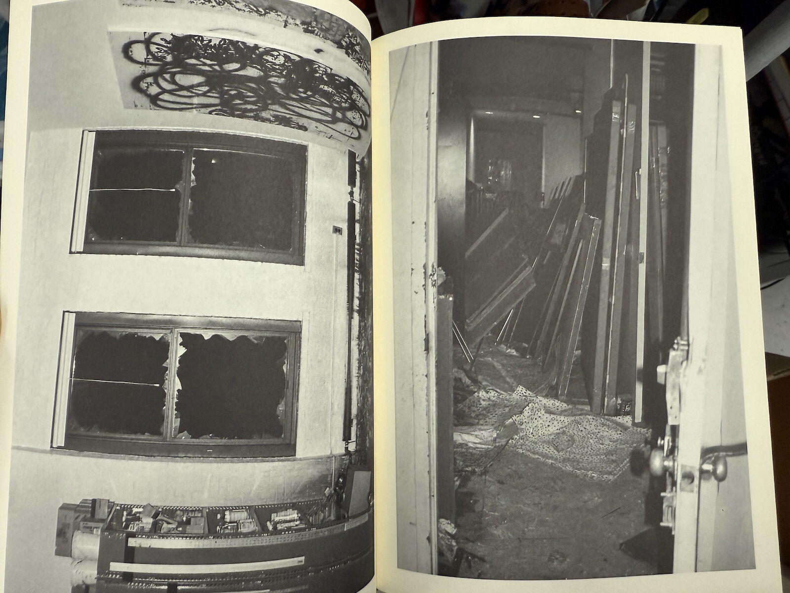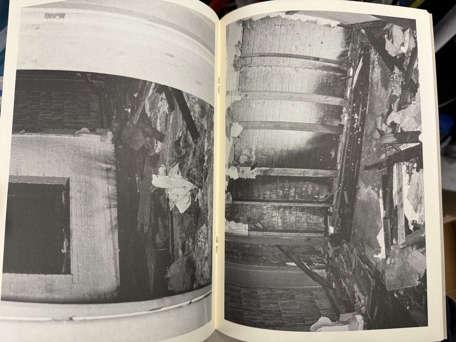 Comprising 13 black-and-white gelatin silver prints, the publication takes the form of a stark, almost forensic visual report. The photographs show scorched interiors and collapsed structures—void of human presence and stripped of sentiment—marking a quiet but potent reflection on loss and material transformation.