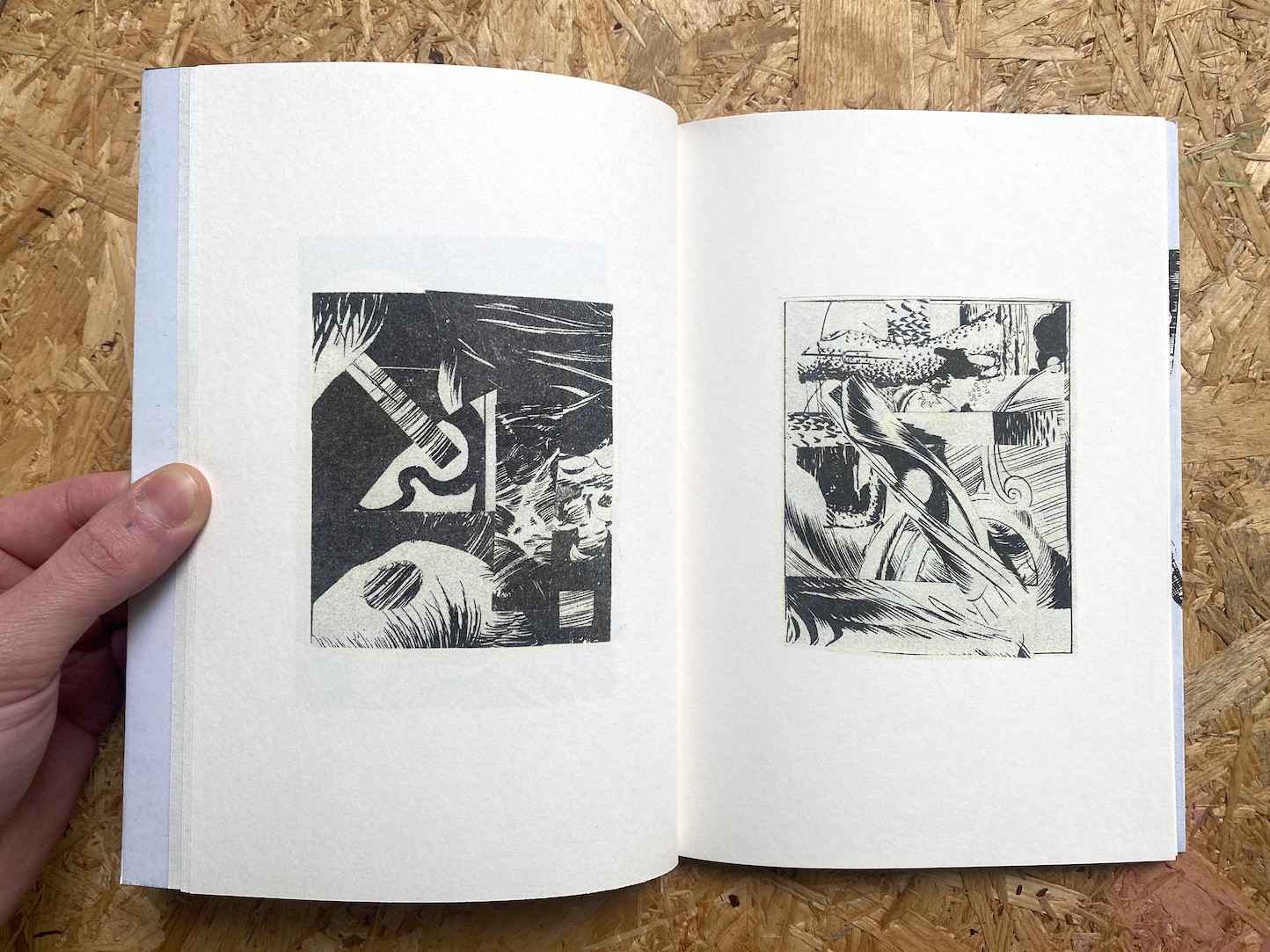 Using cut-and-paste tactics, science fiction narratives are reorganised into images that drift away from conventional representation. The work is reproduced as Risograph prints on the pages, giving the publication a textured, analogue print quality that situates it within the tradition of artist-run small press and zine culture.