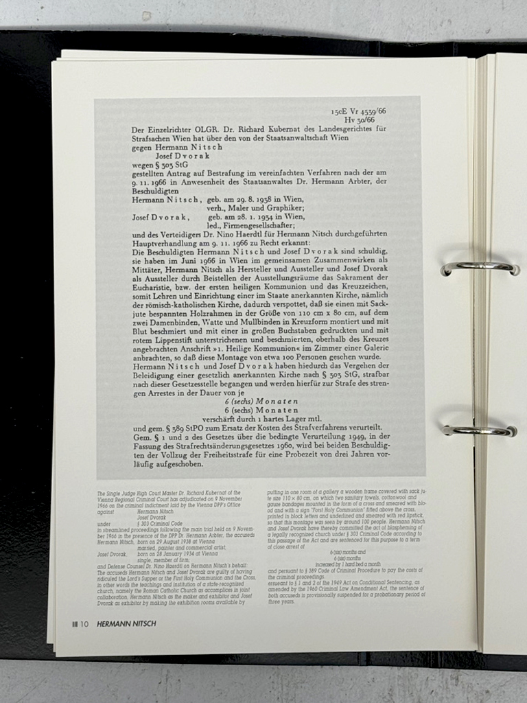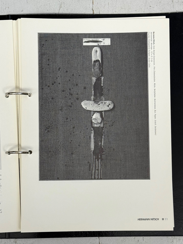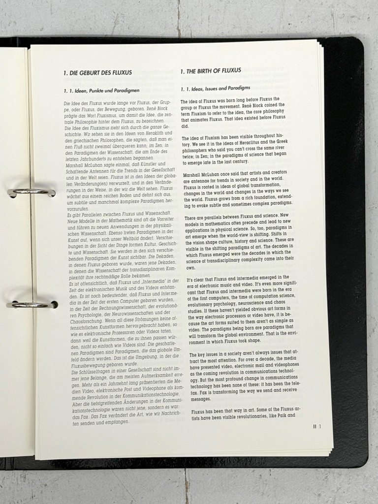 The material form of the catalogue is also central to its content. It was issued as a ring binder, in a format of approximately 32 × 26 cm. This open, not definitively bound form corresponds to the character of Fluxus as a process-based, expandable, and non-closed practice. Antiquarian descriptions refer to the volume as consisting of several separately paginated sections and as being presented in its original ring binder.