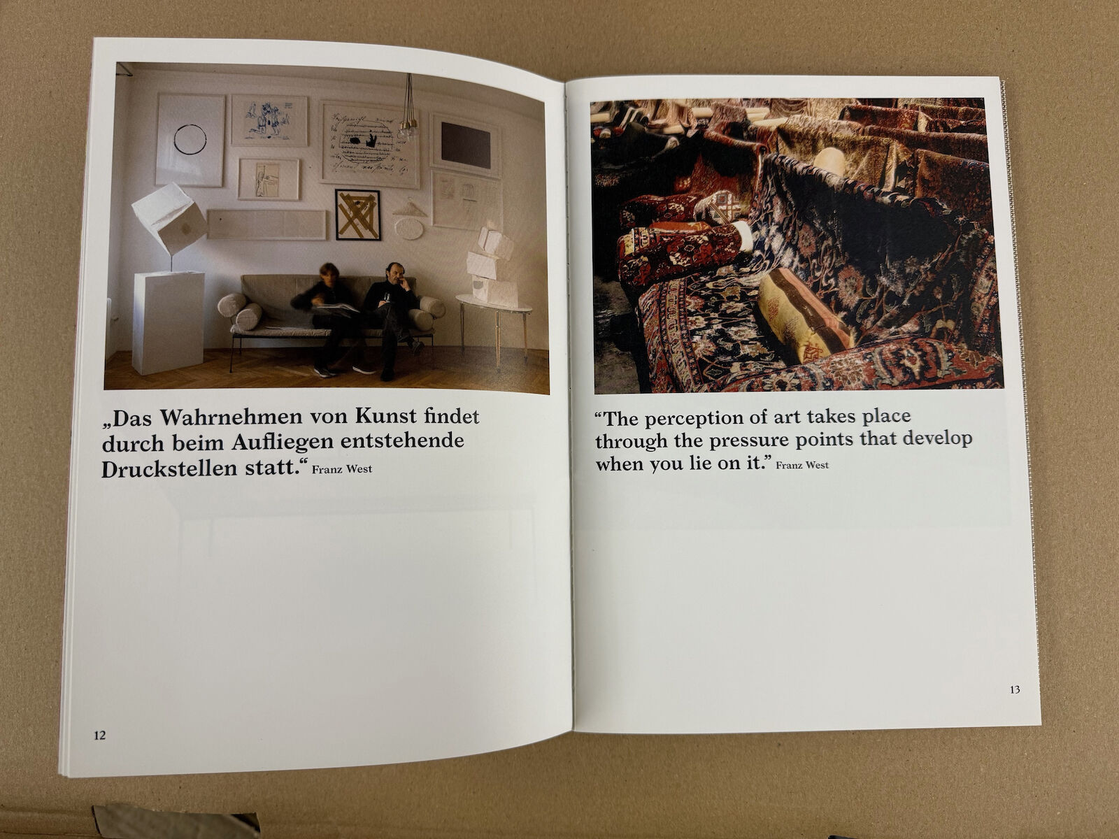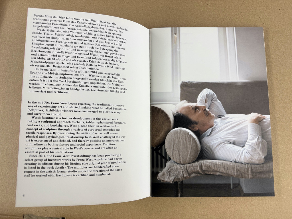 The publication situates these works within installation contexts, interiors, and exhibition environments, demonstrating how West systematically blurred the boundaries between art, everyday culture, and social behaviour. His furniture operates as communicative sculpture, linking use, perception, and reflection on the conditions of artistic experience.