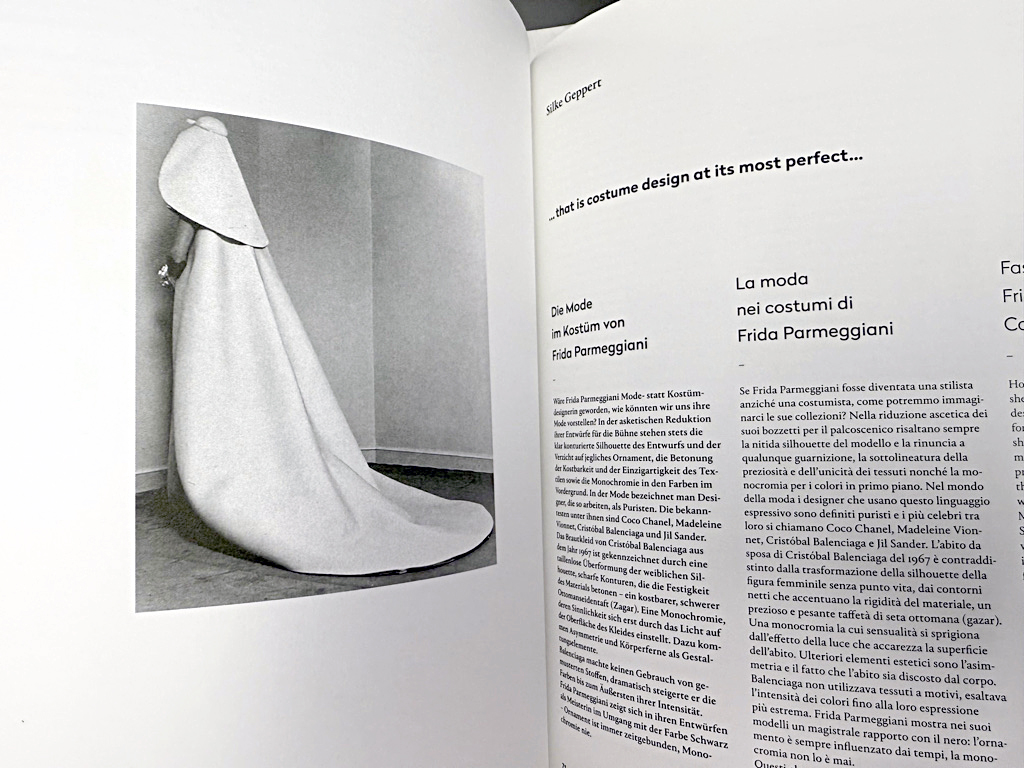 She collaborated with directors such as Hans Hollmann, Götz Friedrich, Rainer Werner Fassbinder, Samuel Beckett and Robert Wilson. On the occasion of her seventieth birthday the Mozarteum Salzburg and Kunst Meran presented an exhibition of new works in summer 2016. At the same time the publication Frida Parmeggiani. Costume Abstractions appeared as the first comprehensive book dedicated to her work.