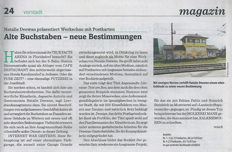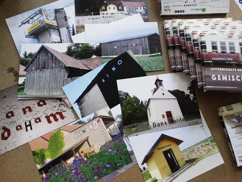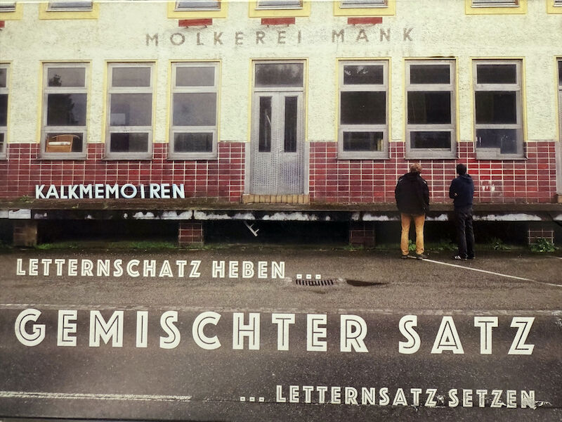 GEMISCHTER SATZ“, das 2016 von Natalie Deewan gemeinsam mit Fabian Faltin und Heinrich Steinböck in Pixendorf / Tullnerfeld / NÖ realisiert wurde. Aus den Aufschriften geschlossener Geschäfte aus dem gesamten Mostviertel wurde in 20 Stationen ein "Gemischter Satz“ zusammengestellt, der tw. immer noch zu sehen/lesen ist: Letternschatz heben / Letternsatz setzen.