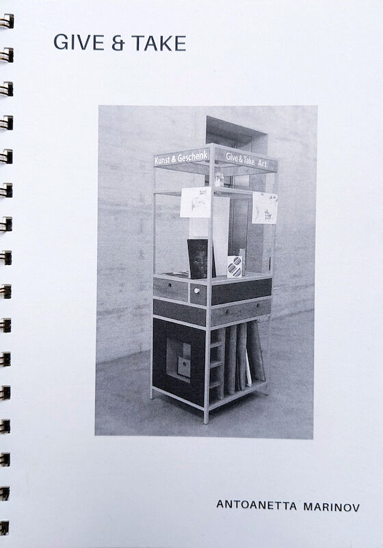 *Give & Take* also references “Give & Take Art,” a display offering art for free, raising questions about the value and pricing of artwork. This display was temporarily stationed at Kunstverein Mannheim, Port 25 Raum für Zeitgenössische Kunst, zeitraumexit, and the gallery Theuer + Scherr. Additionally, *Give & Take Art* was exhibited and activated during the opening of Kunsthalle Mannheim as part of the program *On the Move* in 2017. The event featured a dialogue between Antoanetta Marinov and Sebastian Baden, curator of Kunsthalle Mannheim, which provided the occasion for the creation of this publication.