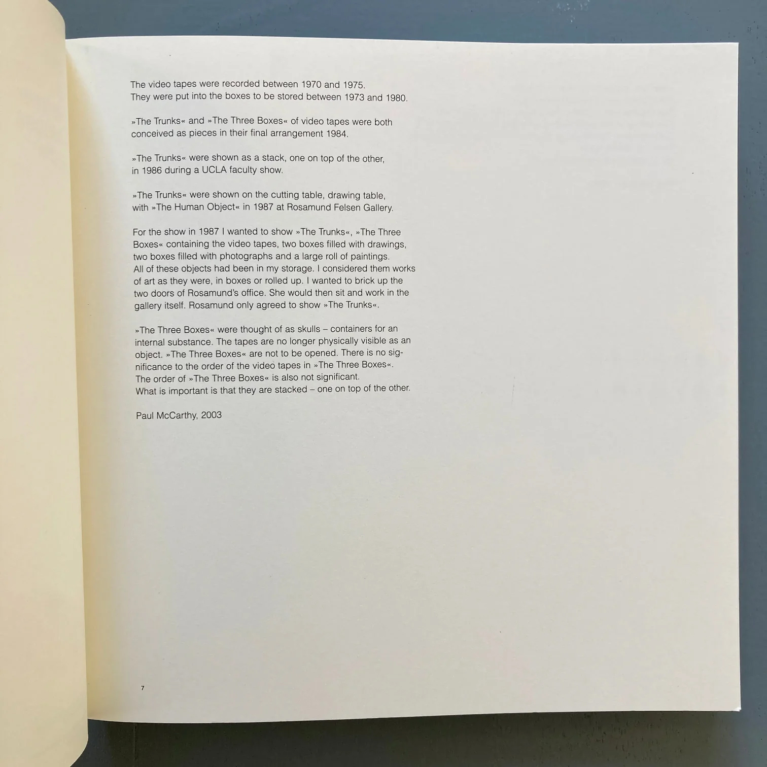 Combining photographic documentation with selected statements by the artist, the publication examines questions of objecthood, storage, and media inscription that recur throughout McCarthy’s practice. The box format functions both as a physical structure and as a conceptual framework, linking performance, video, and sculptural thinking. Rather than offering a retrospective overview, the book concentrates on a specific archival constellation, foregrounding process, repetition, and containment as operative principles.