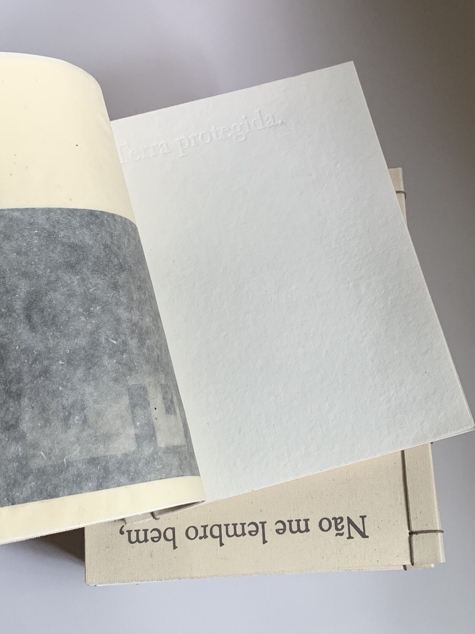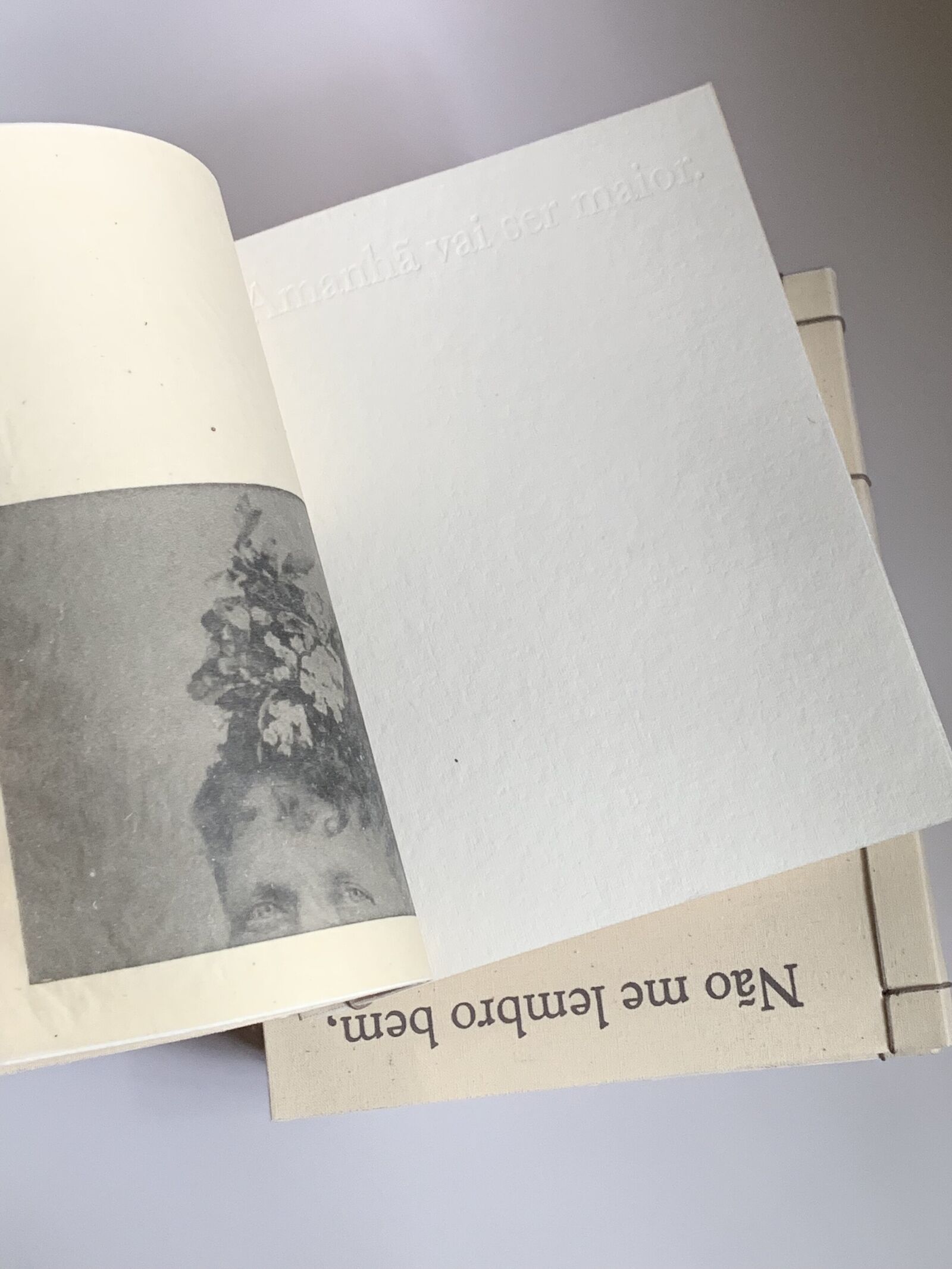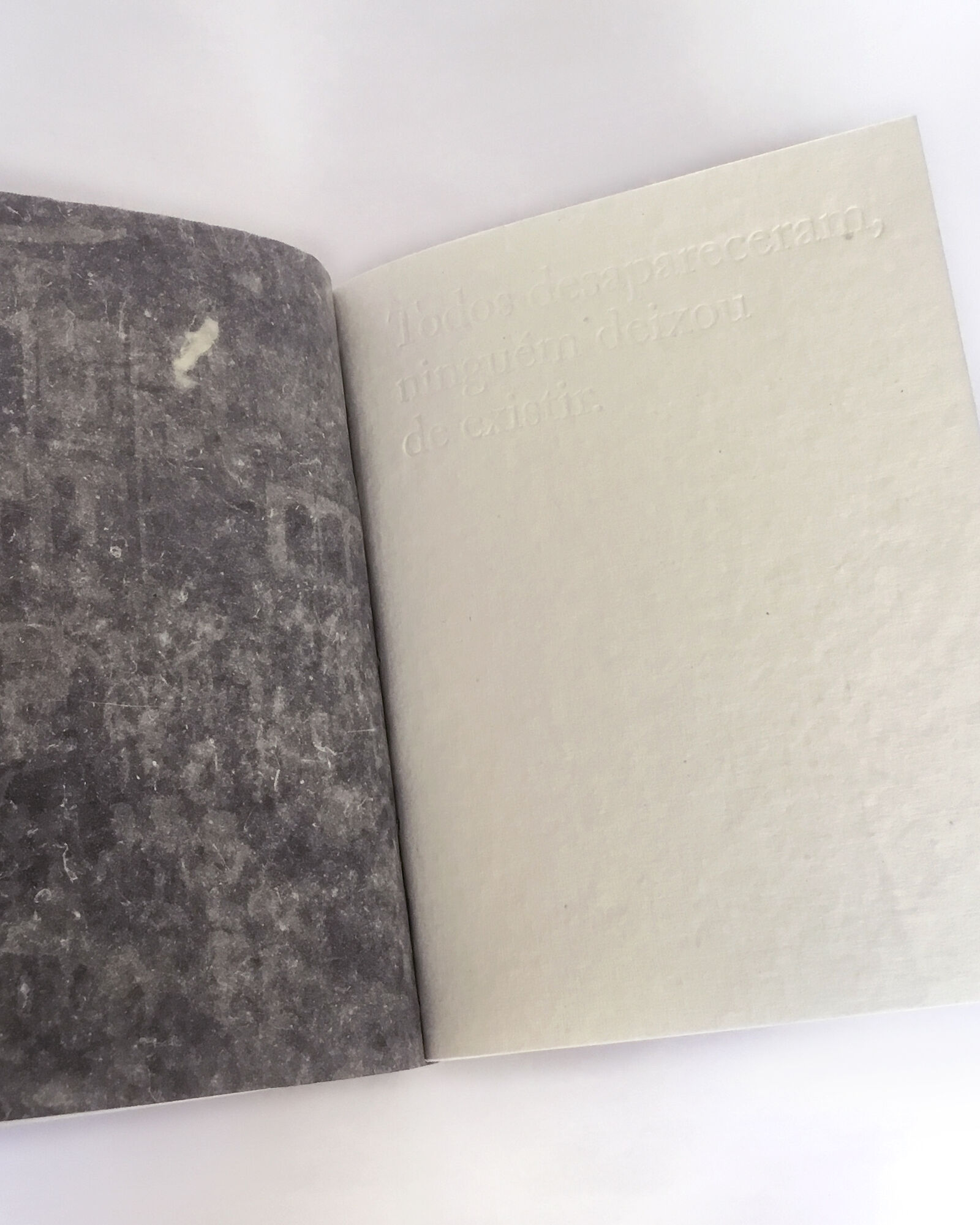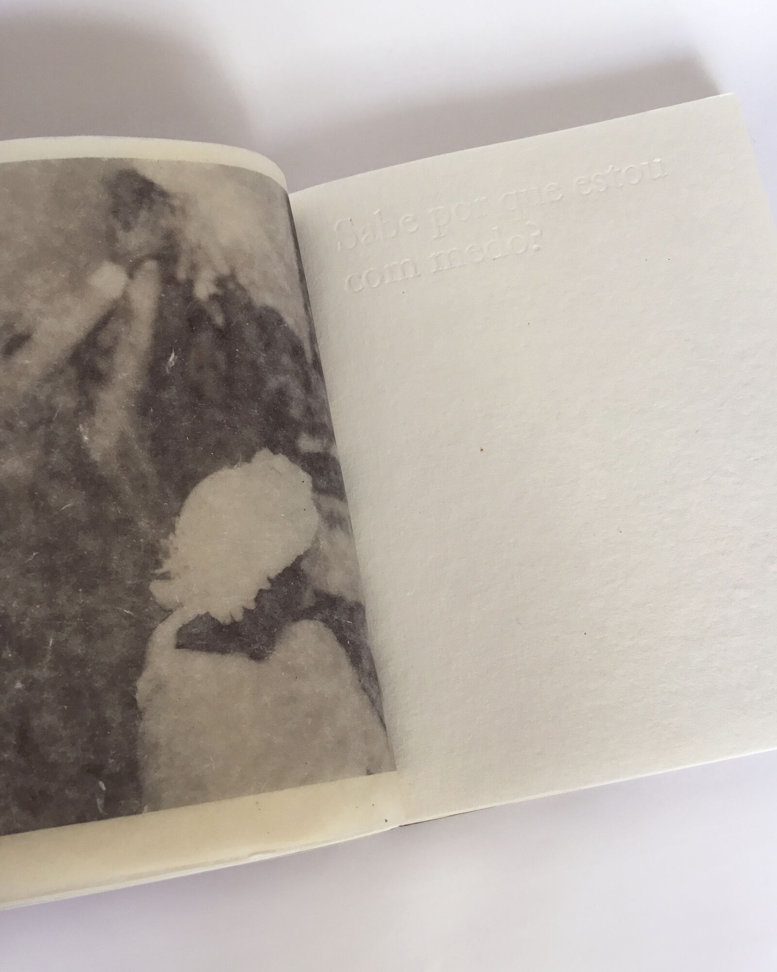 And, regarding that, when did he realize it? Only now. Moreover, what other things did he grasp about the book? That it translates itself into materials that accompany him today. How so? Coldness no longer exists. What exactly does he mean by coldness? As an example, one could mention the use of fabric in his works, on which he performs heat engraving, testing the limits of this material: the point just before the fabric ceases to withstand the heat and ignites. It could also be mentioned that the veiling in his work resided in sheets of glass which have now been transferred to the graphic context of paper, of fabric. Then, could it be said that the book predates his present production? Yes, it ends up working, according to him, as a kind of vaticination. Here, much more is said about him than about the other. Why? Does this work bear intimate things? Yes. Here we see his parents' wedding, we see his grandparents, anyway, very intimate things from his family album. So is the book autobiographical? Perhaps, because all of this passes through him before it turns into work, doesn't it? And what story is told here? It is not clear what story(ies) is(are) told here because the book was born for him in a way that he cannot put into words and that is why there are still many undisclosed elements about the content and construction of the book that remain veiled. Having seen this, what about the texts? They were all thought through works already done. None of the texts that exist here had not existed as a bronze plaque, which, in this context, served as a stamp that marked this cotton paper, a warmer, more affable place. I feel this being fragile. Yes. This being is fragile indeed. The book needs to be taken care of, it is held in your hand, like a body of straw, like a bird. Here, care for oneself and care for the other reverberate. This place reveals a way of speaking from the innermost, without the precise realization of what this place is. That's it. Yes, this is what you have in your hands.