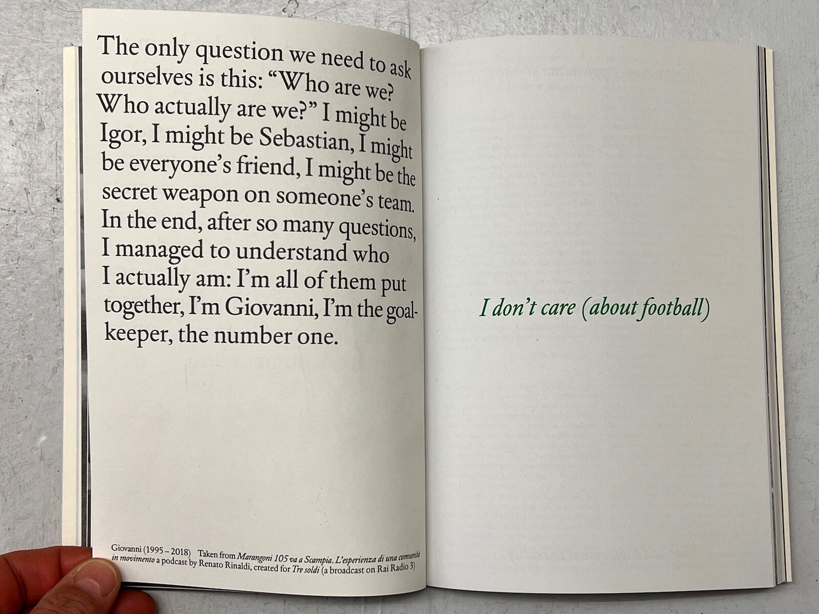 I don’t care (about football) is a participatory artistic project involving the players of the Marangoni 105 football team, created in 2011 as part of one of the rehabilitation residences of the Udine Mental Health Department managed by the Duemilauno Agenzia Sociale Cooperative. The title, inspired by the words of a girl from the community, suggests how the game is not an end in itself but rather a practice of social inclusion and integration.