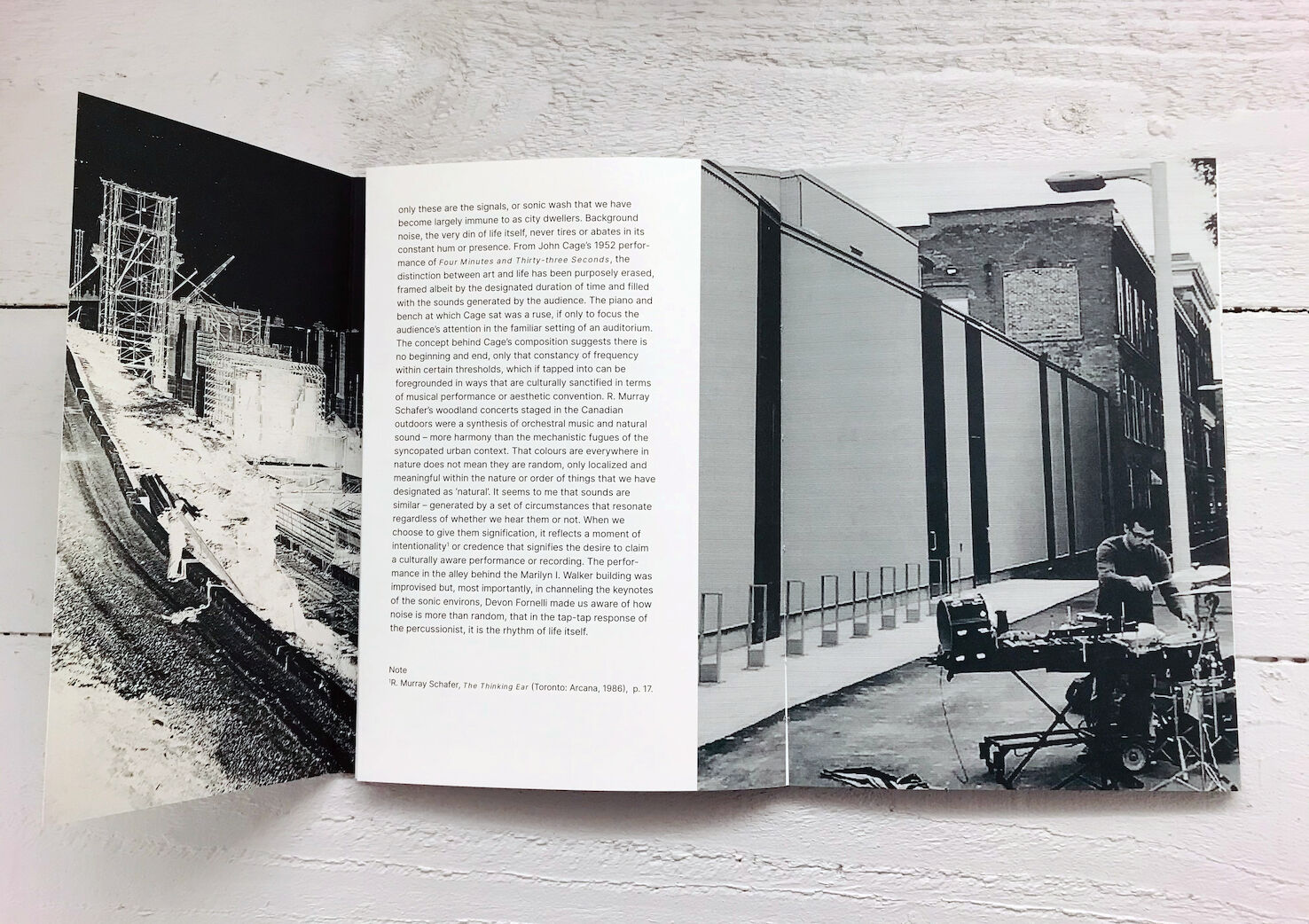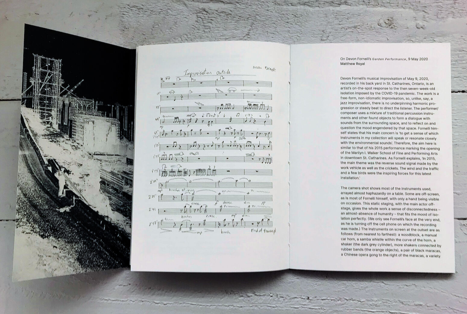 his CitySounds, created on 18 September 2015 for the opening of the Marilyn I. Walker School of Fine and Performing Arts in downtown St. Catharines, Ontario; and his Garden Performance, five years later, on 9 May 2020, offered as a reflection on the COVID-19 pandemic and the temporary lockdown of the MIWSFPA. This documentation includes music notations, three short essays and the only remaining photograph of Fornelli’s improv’ in September 2015. Thomas Ayouti’s short story ‘Aux corps cassés’ – roughly translated, ‘broken bodies’ – offers a counterpoint to Fornelli’s practice. Thematizing the creation of a dance performance, the narrative grows, gains speed, intertwines the dancers’ movements and the narrator’s loving characterization of his friend. Whereas Fornelli’s improvisations express the persisting flow of our environment, Ayouti’s piece follows the fervid crescendo of emotions. This documentation includes music notations, three short essays and the only remaining photograph of Fornelli’s improv’ in September 2015. Thomas Ayouti’s short story ‘Aux corps cassés’ – roughly translated, ‘broken bodies’ – offers a counterpoint to Fornelli’s practice. Thematizing the creation of a dance performance, the narrative grows, gains speed, intertwines the dancers’ movements and the narrator’s loving characterization of his friend. Whereas Fornelli’s improvisations express the persisting flow of our environment, Ayouti’s piece follows the fervid crescendo of emotions.