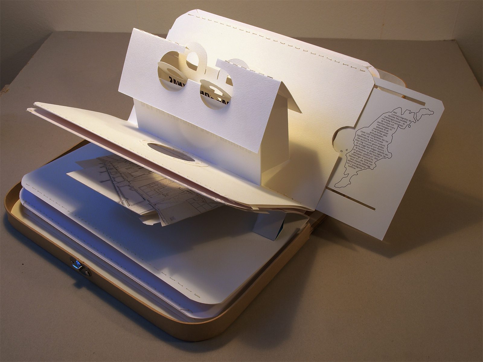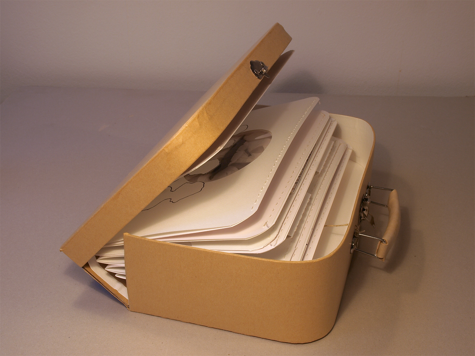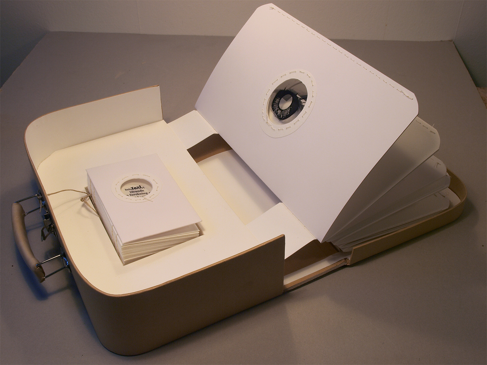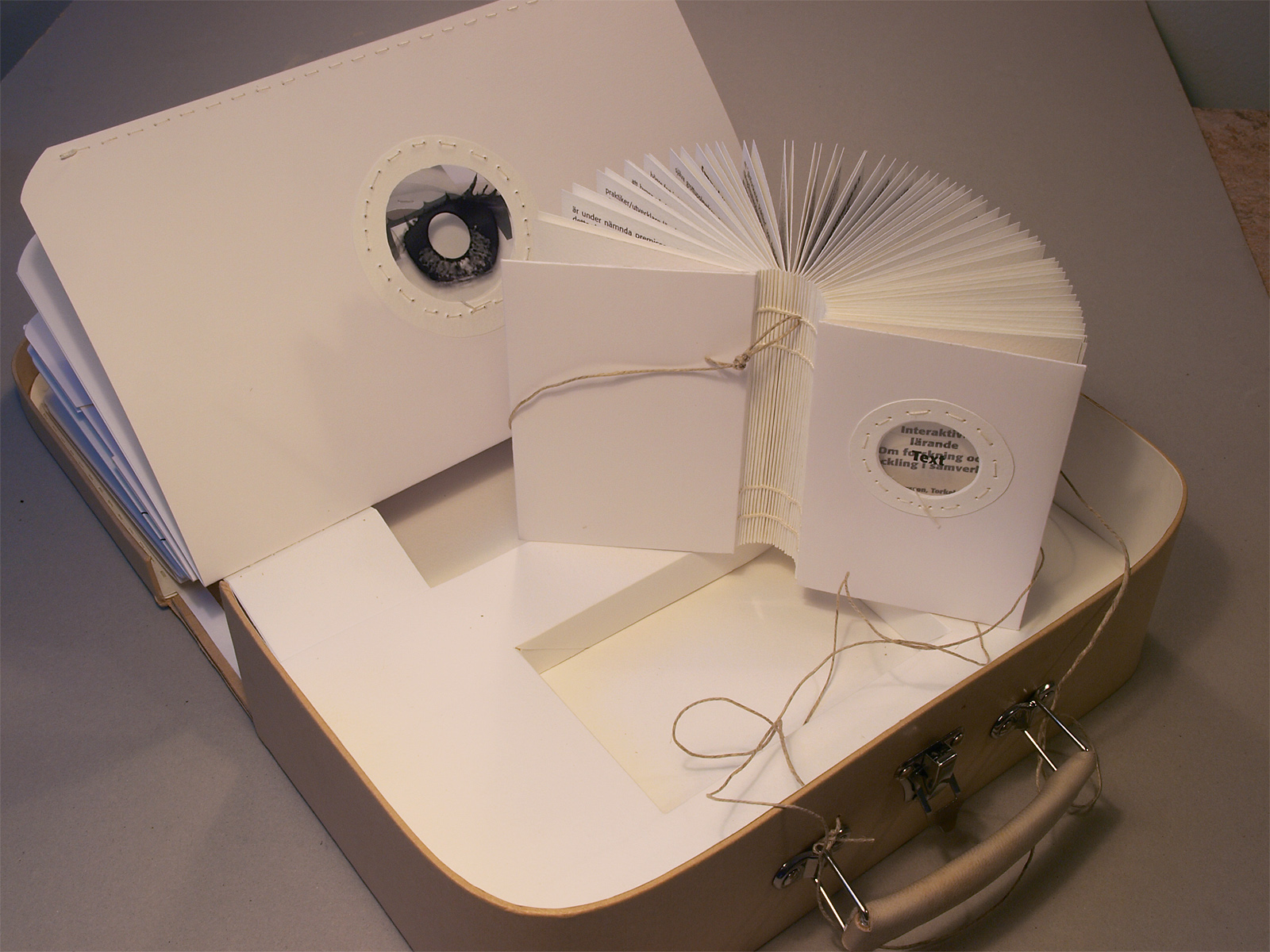 The book Interaktiv is hand sewn and mounted into a cardboard suitcase.