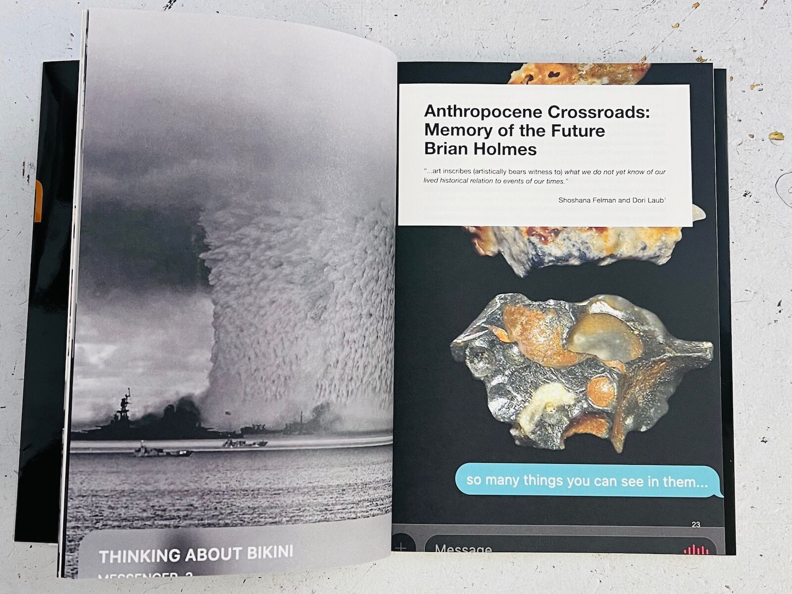 The publication accompanying the exhibition testing grounds reflects Katrin Hornek’s artistic approach, which is based on interdisciplinary research and collaboration. This new, immersive installation deals with the measurable global evidence of radioactive radiation as a result of hundreds of above-ground nuclear weapons tests since 1945. Screenshots of chat histories and