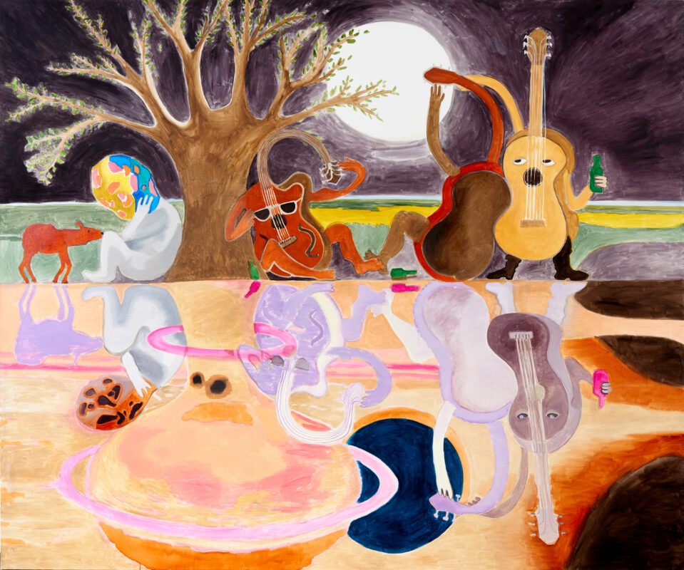 The publication presents a sequence of vividly colored, often figurative works in which hybrid beings, constructed identities, and narrative fragments unfold in a space oscillating between pop-cultural reference and painterly autonomy.