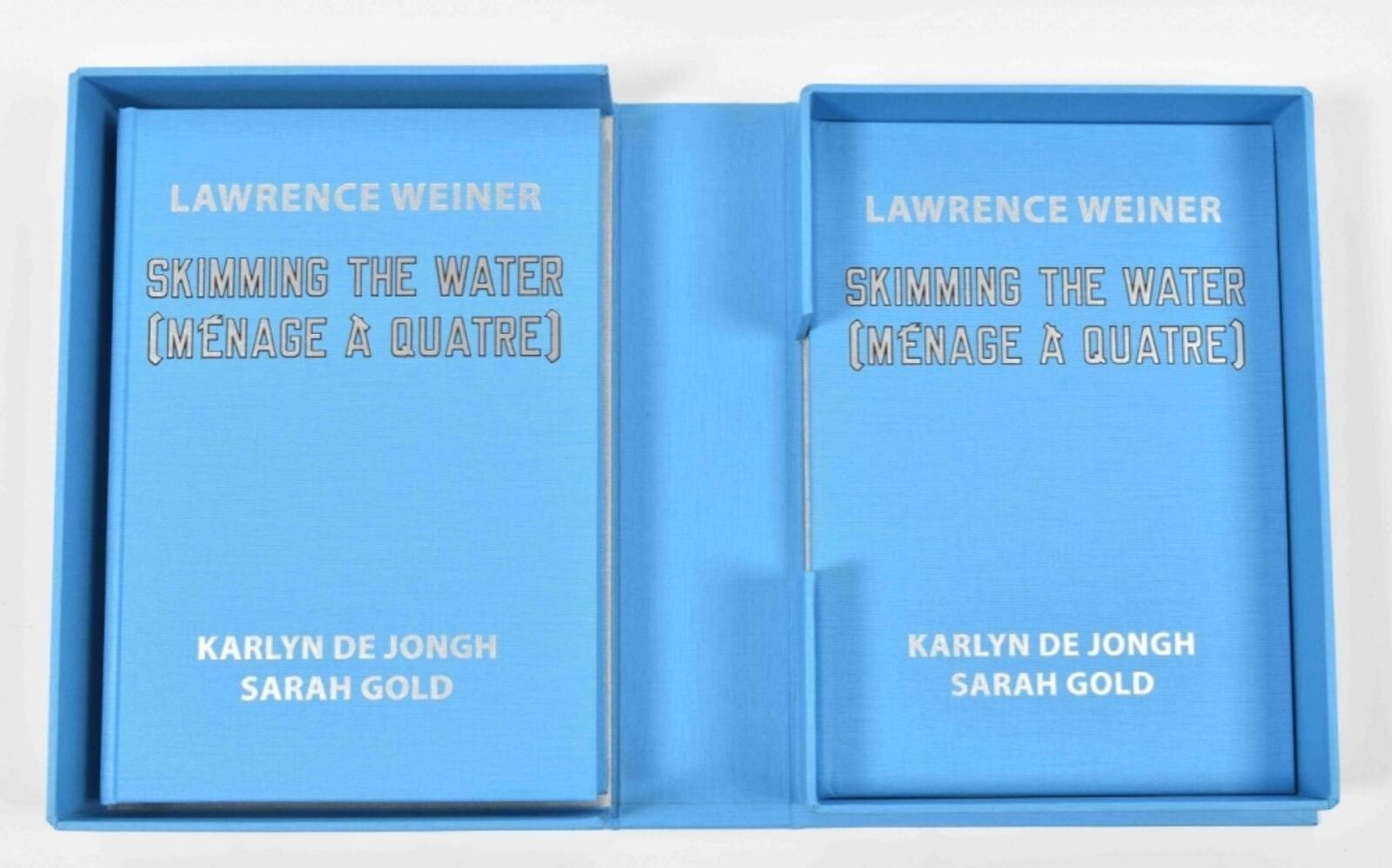His installations, such as the site-specific "SOME LIMESTONE SOME SANDSTONE ENCLOSED FOR SOME REASON" (1993), and his participation in projects like "Personal Structures Time-Space-Existence," showcased his enduring interest in the interaction between text, space, and audience. Blue box containing a Gauloises blue cloth-covered cassette, 24 x 27 x 6 cm, with a blue book, 224 pp. featuring a typical Weiner designed title added in silver lettering, and a CD housed in a silver-lettered cloth-covered cardboard case. Loosely inserted is an aluminum stencil with die-cut text. Housed in blue cardboard box.